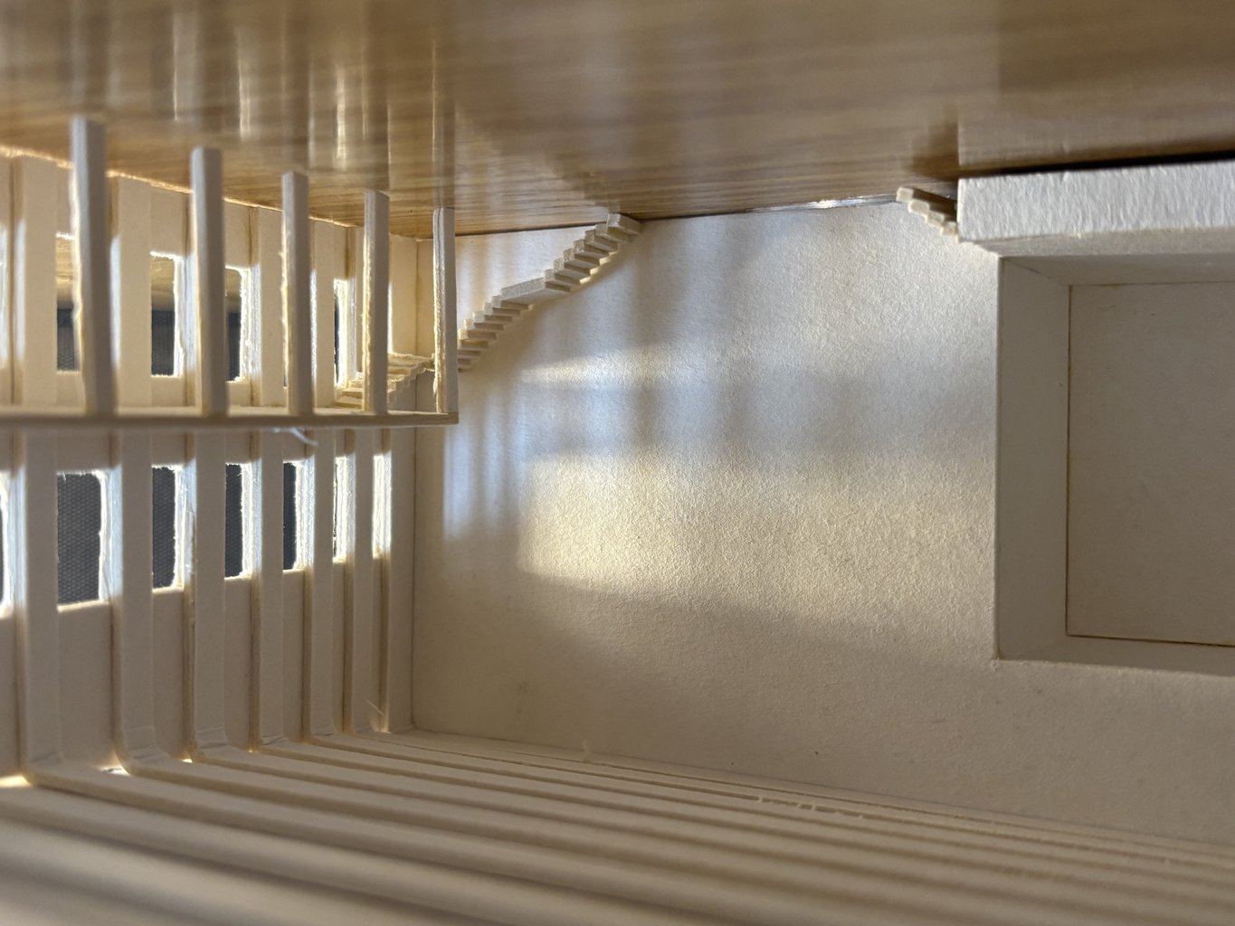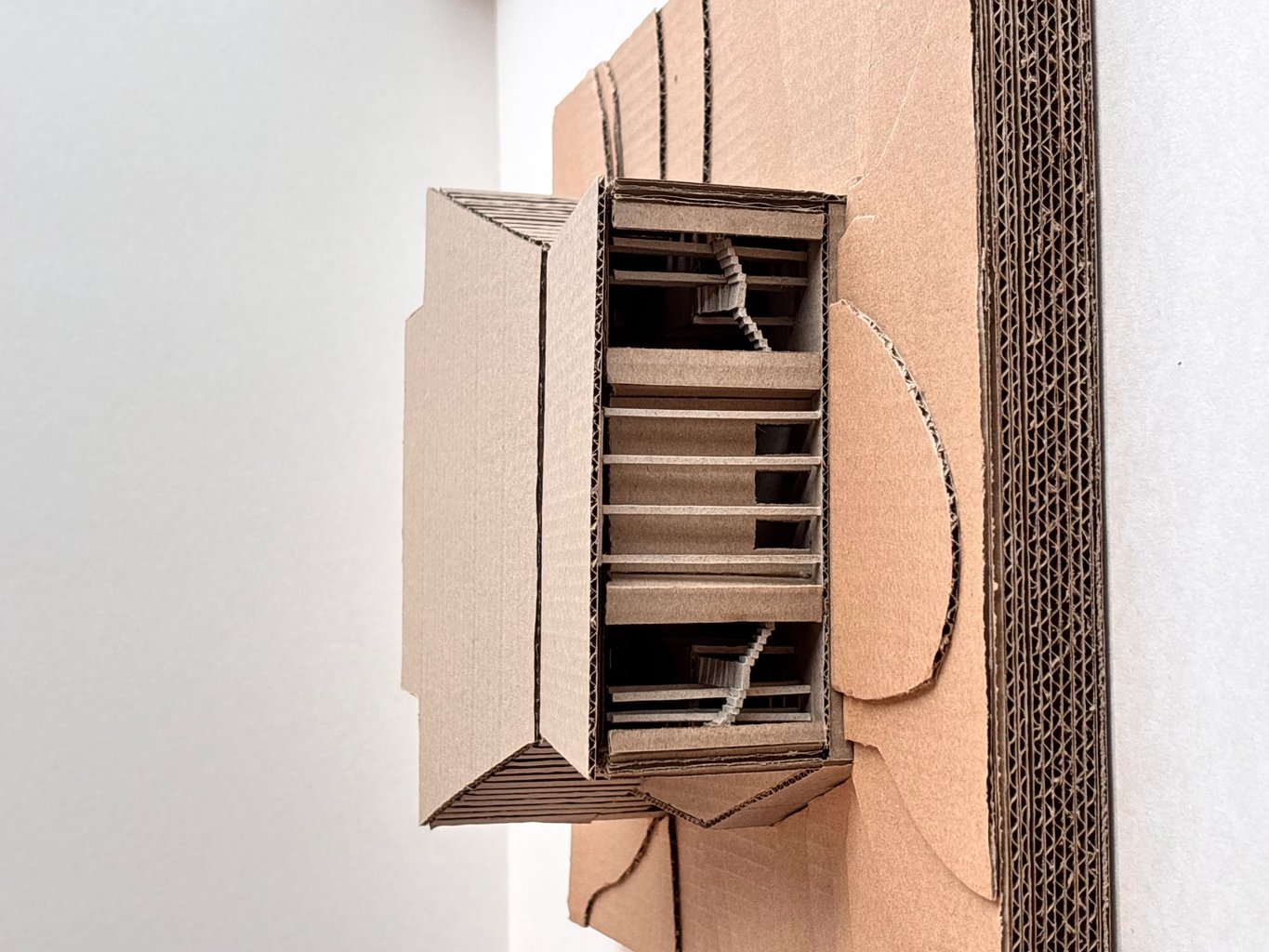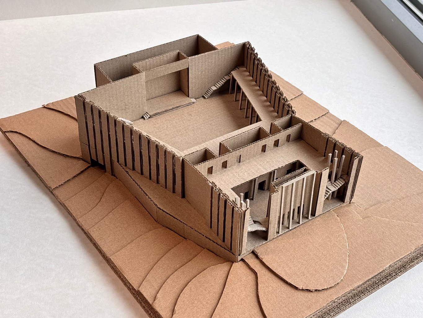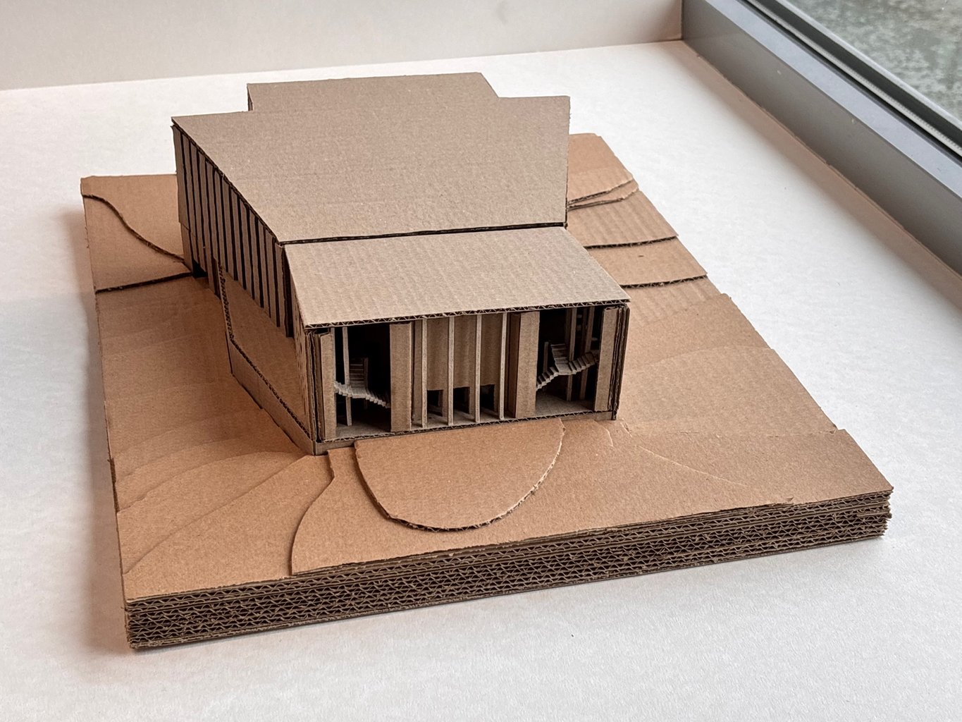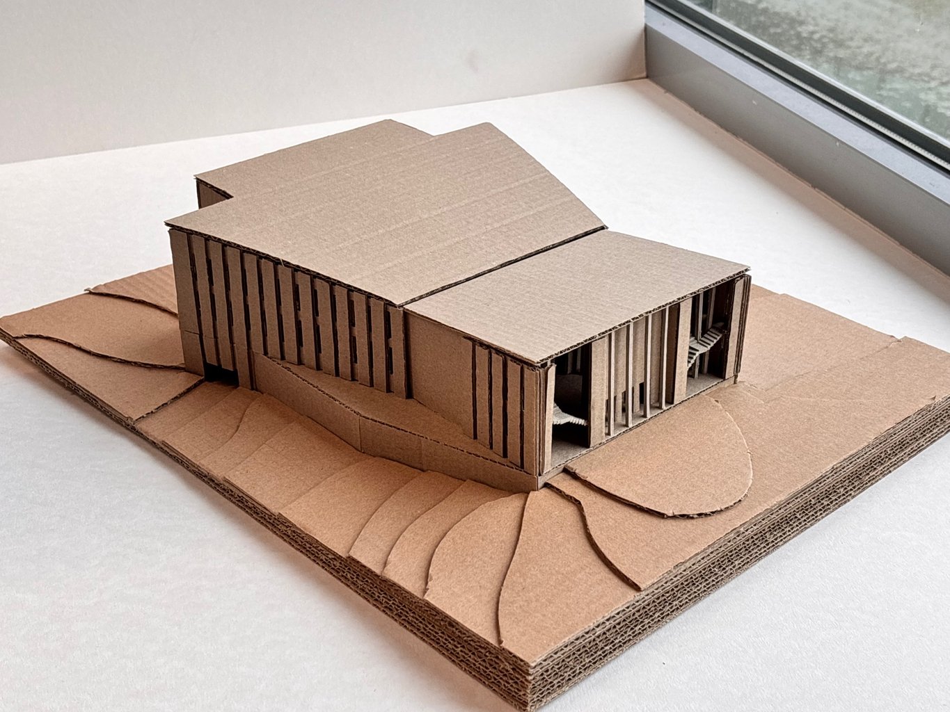 Tvar budovy vychází z lichoběžníkového tvaru pozemku a současně pracuje s převýšením terénu, které činí přibližně jedno podlaží. Parkování je navrženo v podzemí, s vjezdem z nižší ulice přiléhající k pozemku. Z vyšší ulice bude parkoviště zcela ukryté pod budovou, nad terén vystoupí pouze dvě patra hlavního sálu. Nad vjezdem do podzemního parkoviště navrhuji terasu, která bude součástí kavárny. Terasa bude zčásti uzavřená dvěma stěnami, což jí dodá intimnější atmosféru, a zároveň ji od ruchu ulice oddělí pás zeleně se stromy.
