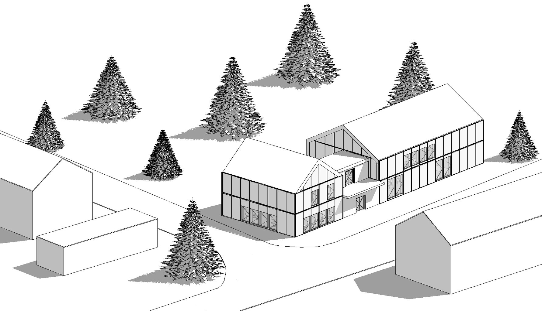 Projekt společenského sálu v Srní na Šumavě vychází z respektu k místnímu kontextu a tradiční architektuře. Návrh se skládá ze tří propojených hmot – hlavním prostorem je multifunkční sál určený pro společenské a kulturní akce, dále část s bistrem a wellness, třetí hmota slouží jako komunikační spojnice. Právě tento prvek, s betonovou konstrukcí a plochou střechou, dynamicky narušuje jinak tradiční uspořádání a přináší soudobý architektonický akcent. Obě hlavní stavby,P sál a bistro jsou řešeny jako dřevostavby se sedlovými střechami, čímž reflektují místní stavební tradici. Fasády všech částí propojuje výrazný dřevěný skelet, který zdůrazňuje přírodní charakter stavby a její začlenění do šumavské krajiny. Projekt usiluje