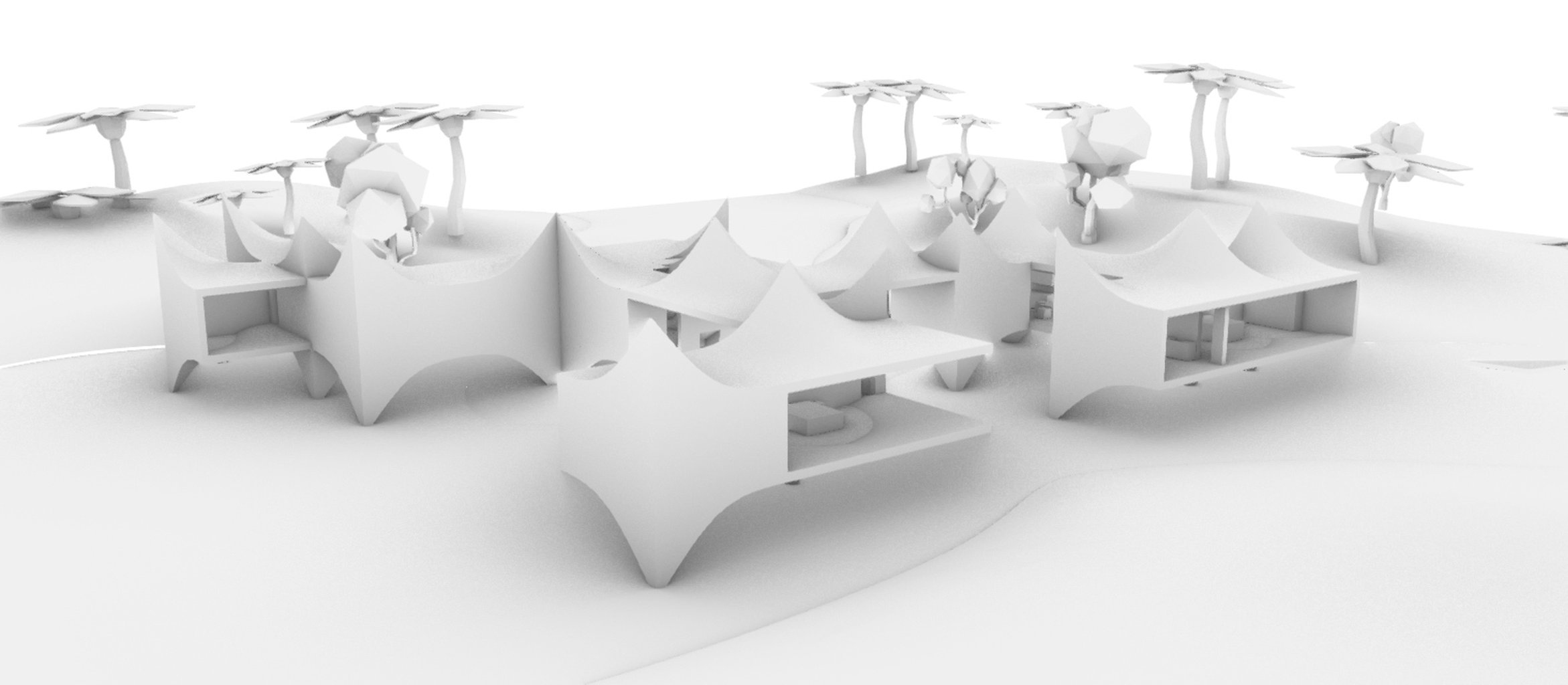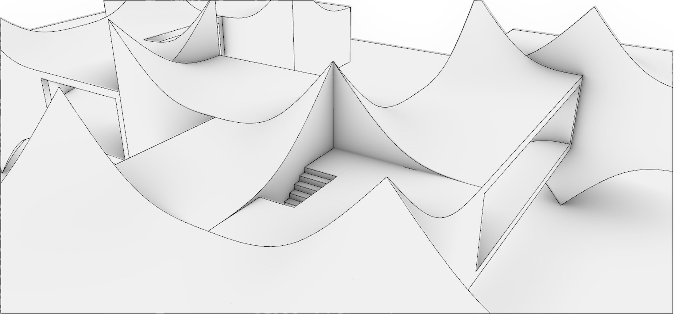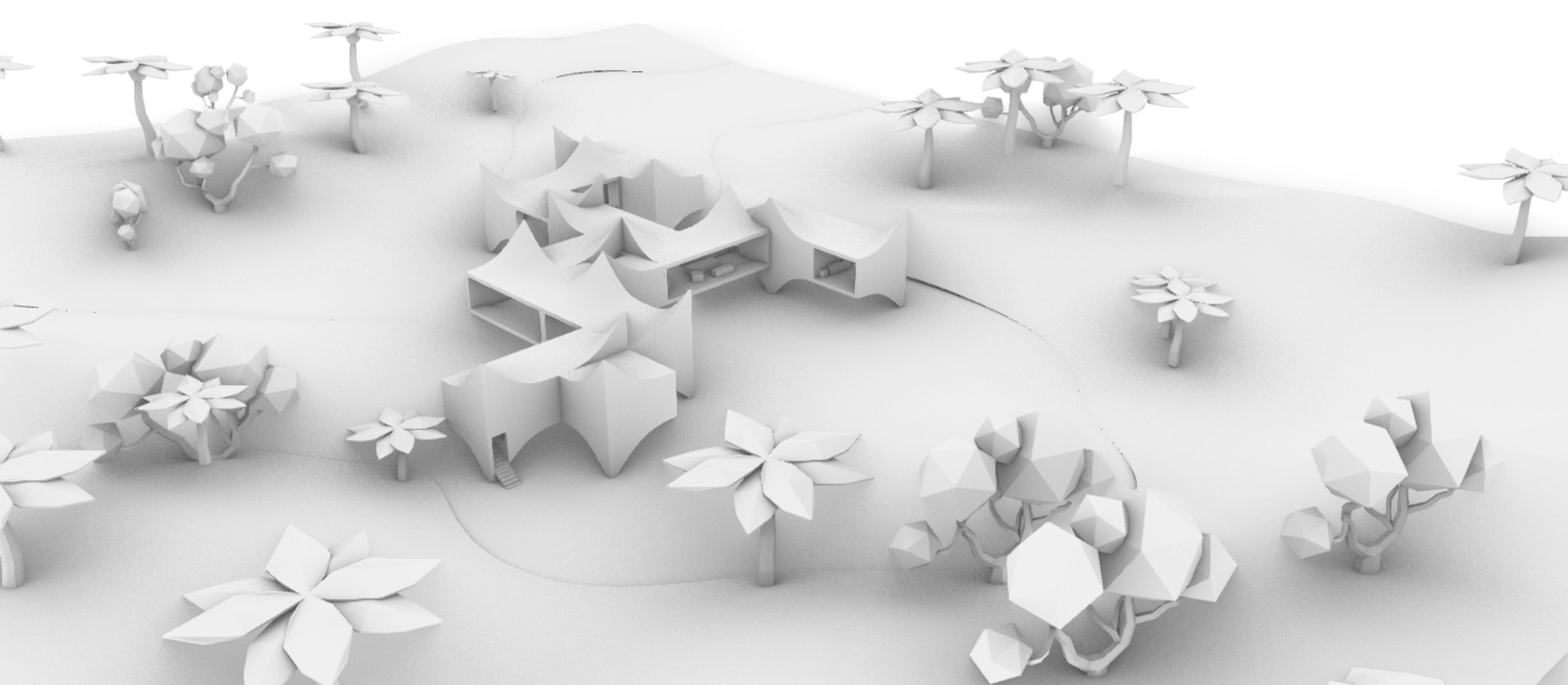 Střešní design mého návrhu vychází z tvarů Rumah Gadang (Sumatra) a Tongkonan (Sulawesi) – domů s dramaticky zakřivenými střechami, které odrážejí přirozený pohyb, symboliku býčích rohů a dynamiku života. Tyto prvky jsem zjednodušila do čistých, organických tvarů, které se opakují v celé kompozici. Tvar střechy se zároveň zrcadlí i v dolní úrovni vily.
