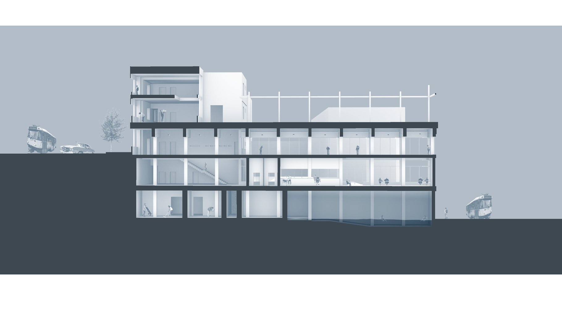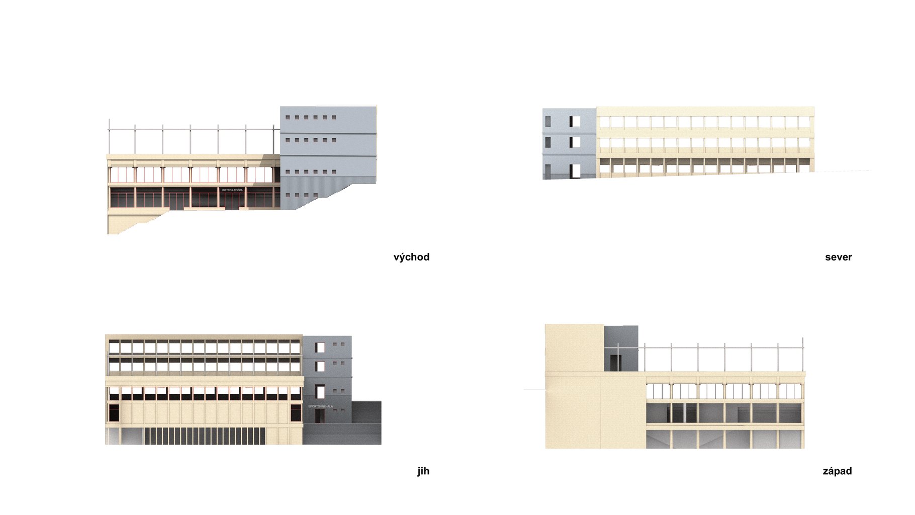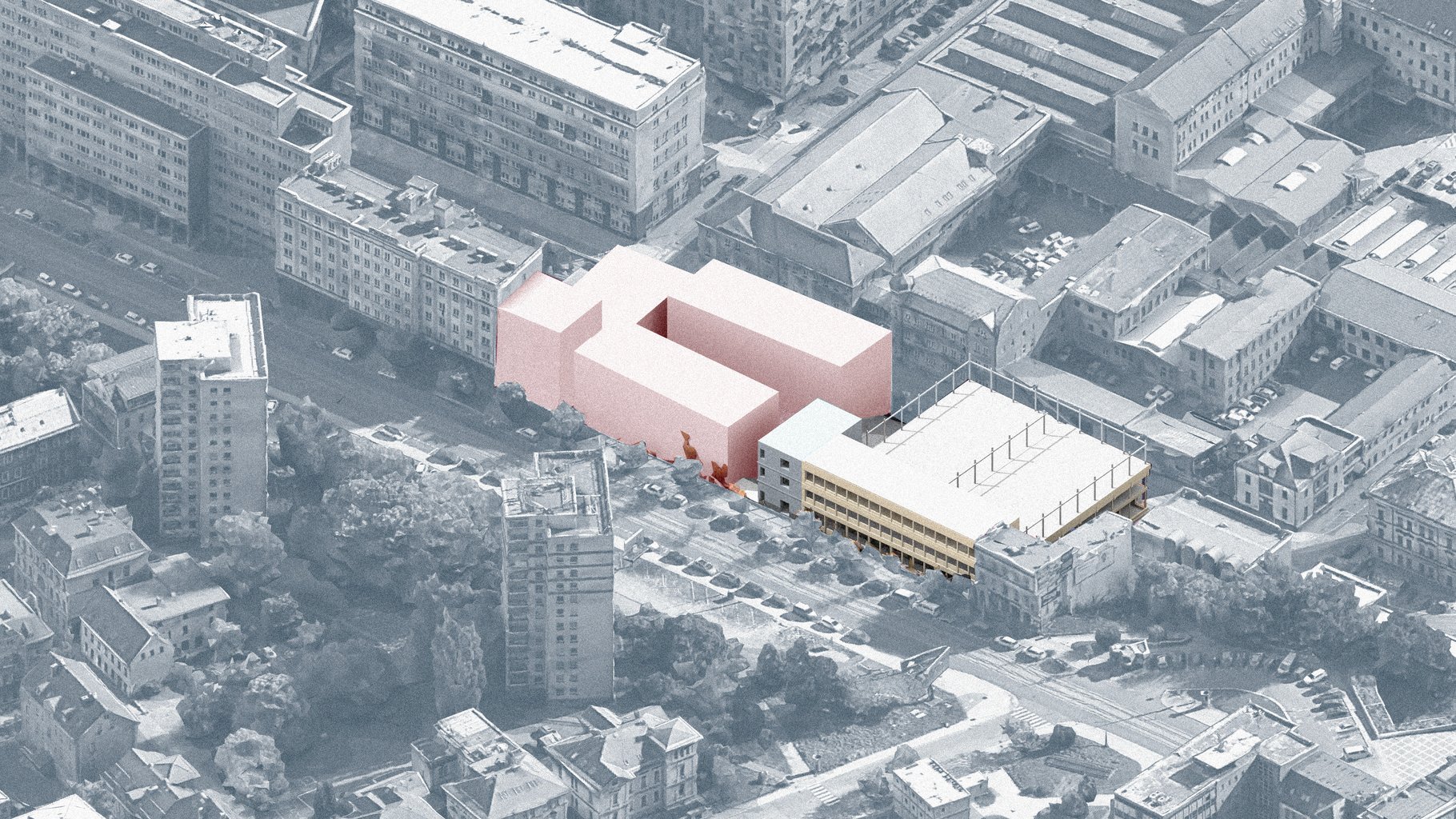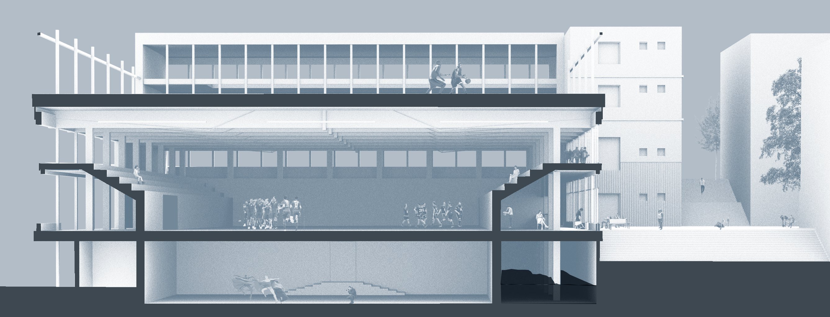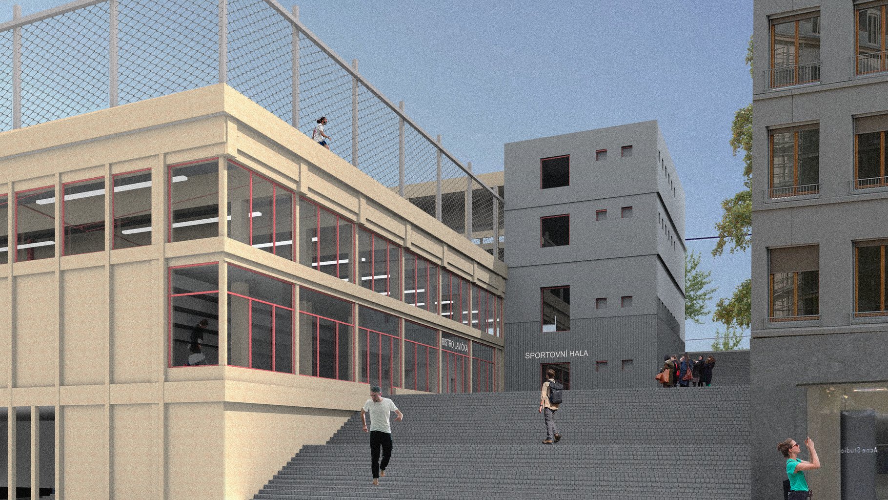 Sportovní hala uprostřed města? Co by ne?! Na jednu takovou právě vznikl návrh! Nachází se v Liberci na hlavní spojnici mezi nádražím a centrem města. Je v ulici která má potenciál a předpoklady být Libereckým bulvárem. Samotný pozemek má mnoho specifik, ale tím nejzajímavějším je jeho převýšení, jež v nejvyšším bodě činí až 9 metrů. Na pozemku se nenachází pouze zmiňovaná hala. Díky její výměře jsou na ní dále umístěny 3 bytové domy, které společně s halou uzavírají skromné náměstí, skrz které je možné po schodech sejít z bulváru do nově vznikající čtvrti.