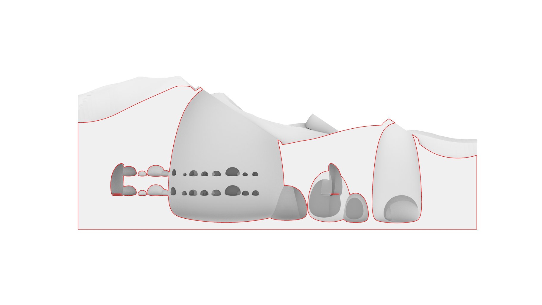 Převážná část stavby se nachází pod zemí. Je zcela soběstačná a nabídne obyvatelům vše co by mohli potřebovat. Sestává se z různě deformovaných kulovitých prostor. Tři hmoty jsou takto protaženy nad povrch a tvoří vstupy. Jejich horní zkosení je inspirované tvarem pohyblivé duny, která na své závětrné straně nepřesáhne úhel čtyřicet čtyři stupňů. Předpokladem je, že budou měnící se písečné duny výčnělky stavby obtékat.