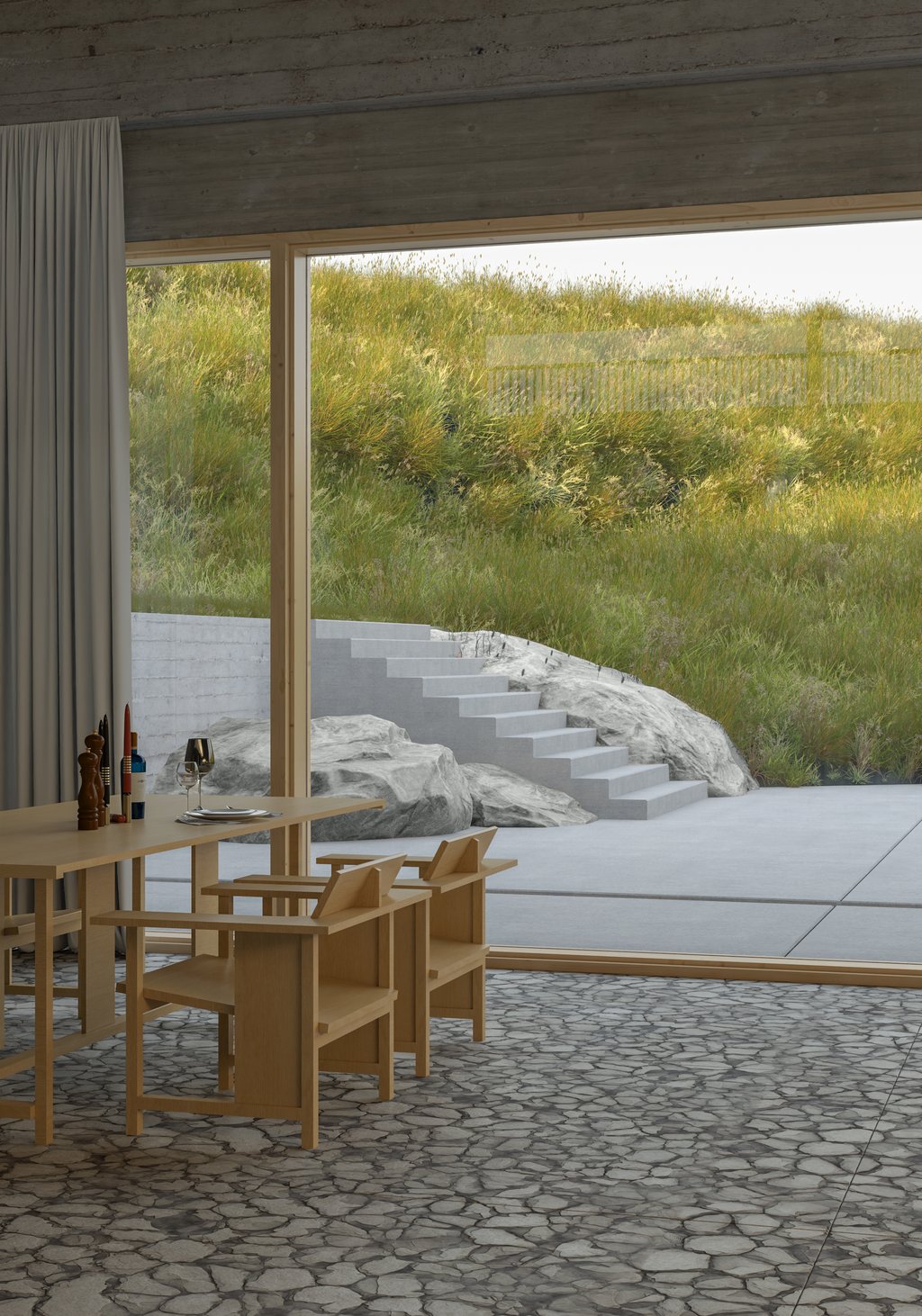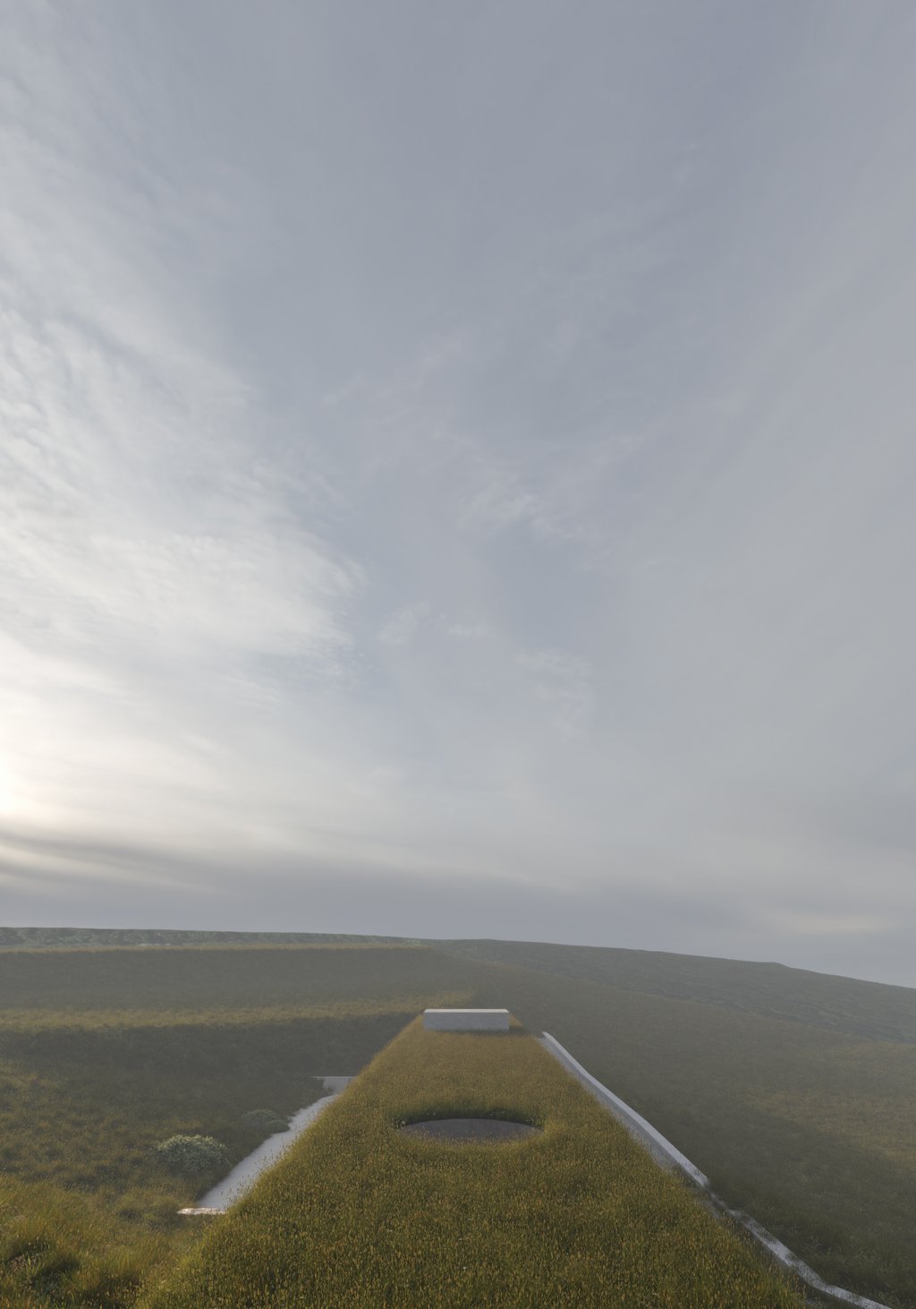 Typologicky se jedná o podélnou, průchozí strukturu přístupnou z více stran. Objekt je záměrně otevřený – horizontálně i vertikálně. Interiér se neustále rozšiřuje a ztrácí do krajiny: skrz prázdná místa, rampy a terasy, které vybízejí k pomalému pohybu. Inspirací byly ruiny Itálie – místa, kde dávno zmizela funkce, ale prostor stále dýchá.