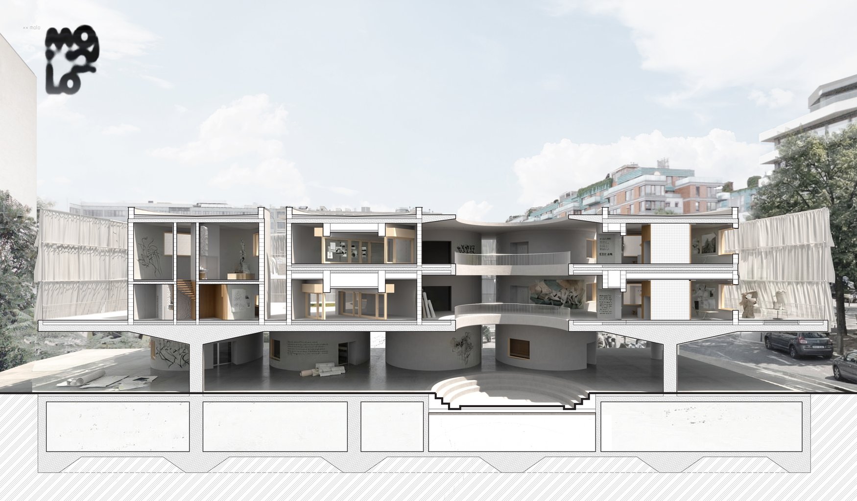 Projekt dočasného ubytování pro umělce vzniká jako kritická reakce na proces gentrifikace pražského Karlína, zejména jeho současnou podobu formovanou ekonomickými zájmy a homogenní sociální strukturou. Z kdysi vrstevnaté, živé a sociálně pestré čtvrti se postupně stává sterilní prostředí určené úzké skupině ekonomicky privilegovaných obyvatel, zatímco jiné formy života, práce a kultury jsou z prostoru systematicky vytlačovány. Navrhovaná stavba vstupuje do tohoto kontextu jako vědomé narušení normy — chuligánské gesto v nejlepším slova smyslu. Neusiluje o harmonické splynutí s uhlazeným obrazem čtvrti, ale naopak do něj vnáší kontrolovaný kulturní chaos, otevřenost a svobodu. Dočasné ubytování pro umělce zde funguje jako nástroj, jak znovu aktivovat území, které se stalo uzavřeným a sociálně nedostupným. Molo tuto logiku narušuje — ne snahou o integraci, ale záměrnou nekompatibilitou.