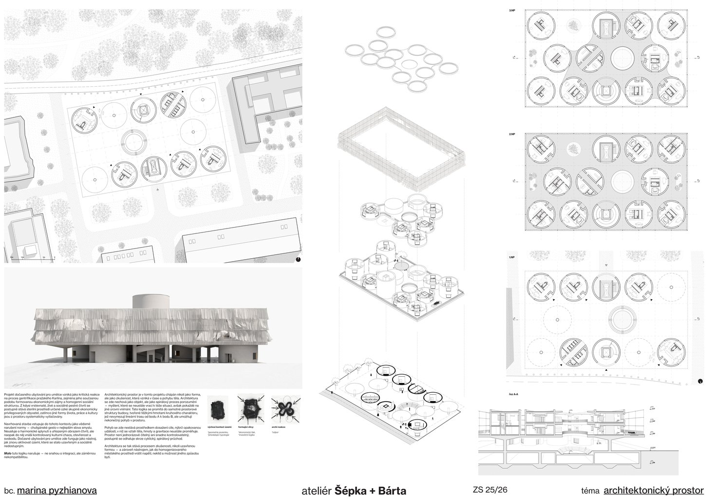 Architektonický prostor je v tomto projektu chápán nikoli jako forma, ale jako zkušenost, která vzniká v čase a pohybu těla. Architektura se zde nechová jako objekt, ale jako spirálový proces porozumění — myšlení, které se neustále vrací k téže situaci, avšak pokaždé na jiné úrovni vnímání. Tato logika se promítá do samotné prostorové struktury budovy, tvořené těžkými hmotami kruhového charakteru, jež nevymezují lineární trasu od bodu A k bodu B, ale umožňují nekonečný pohyb v prostoru.