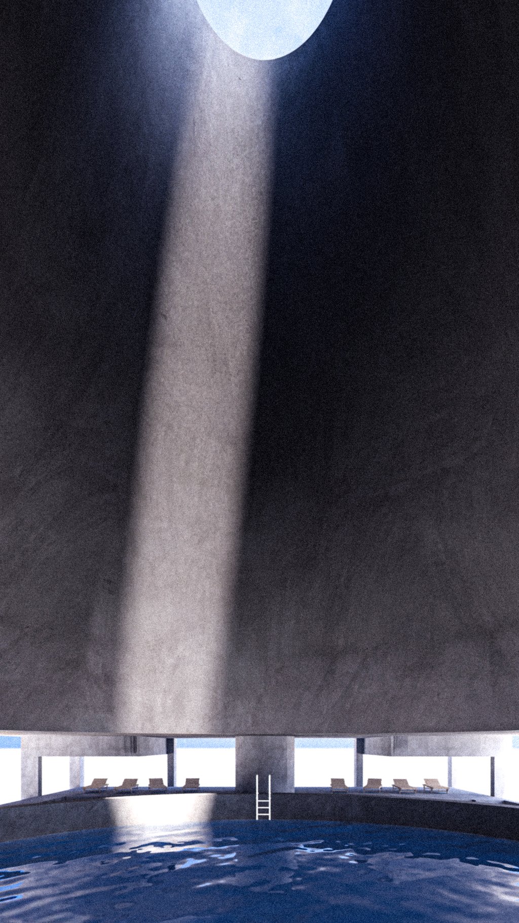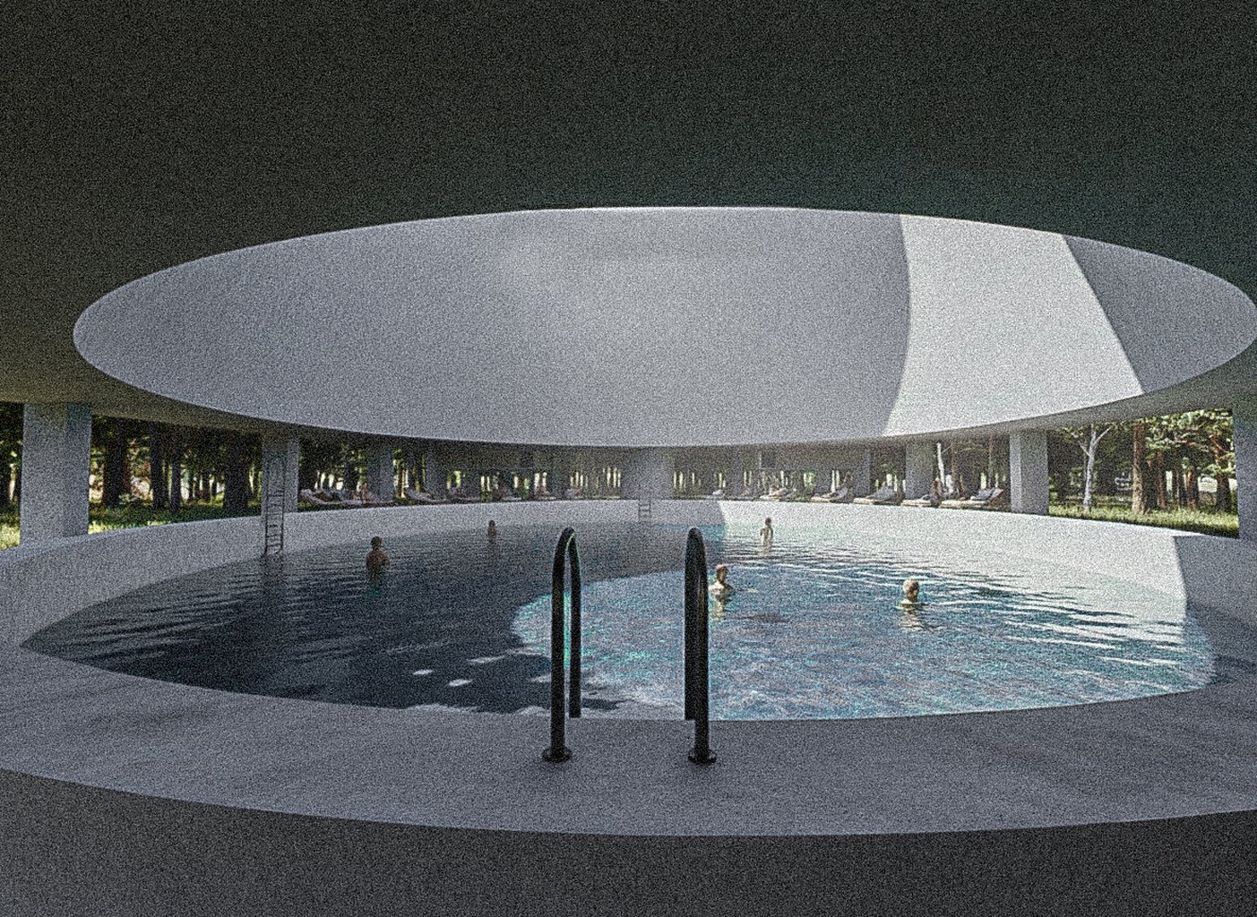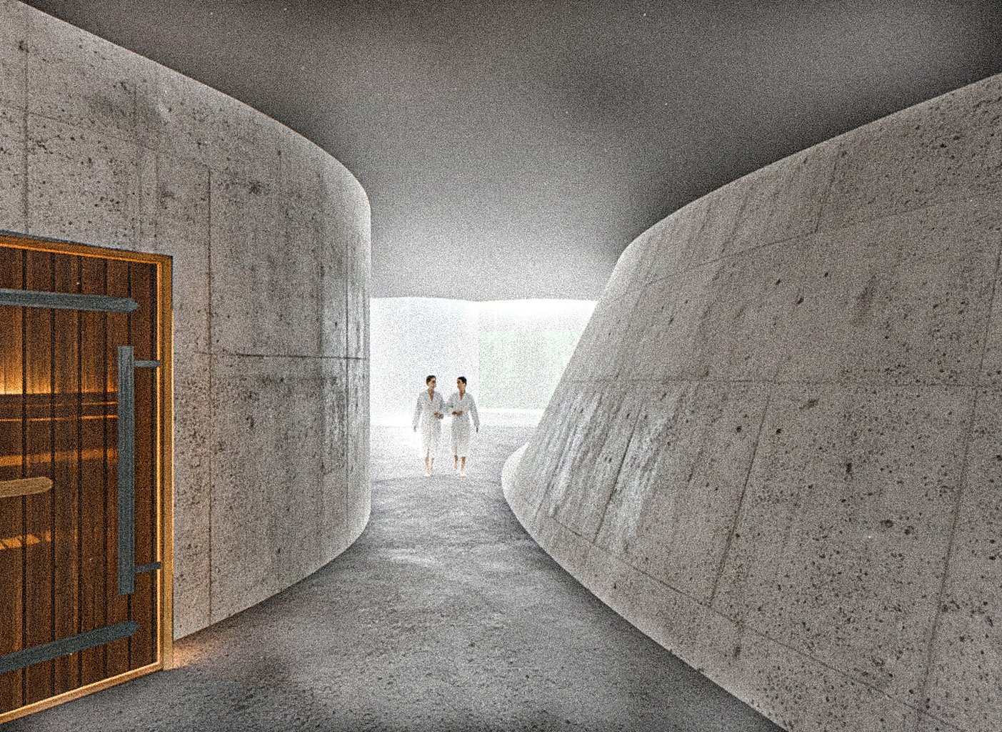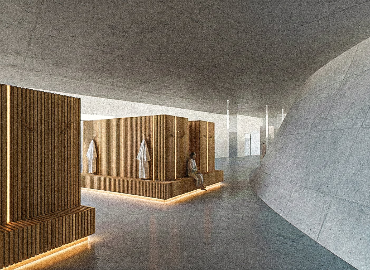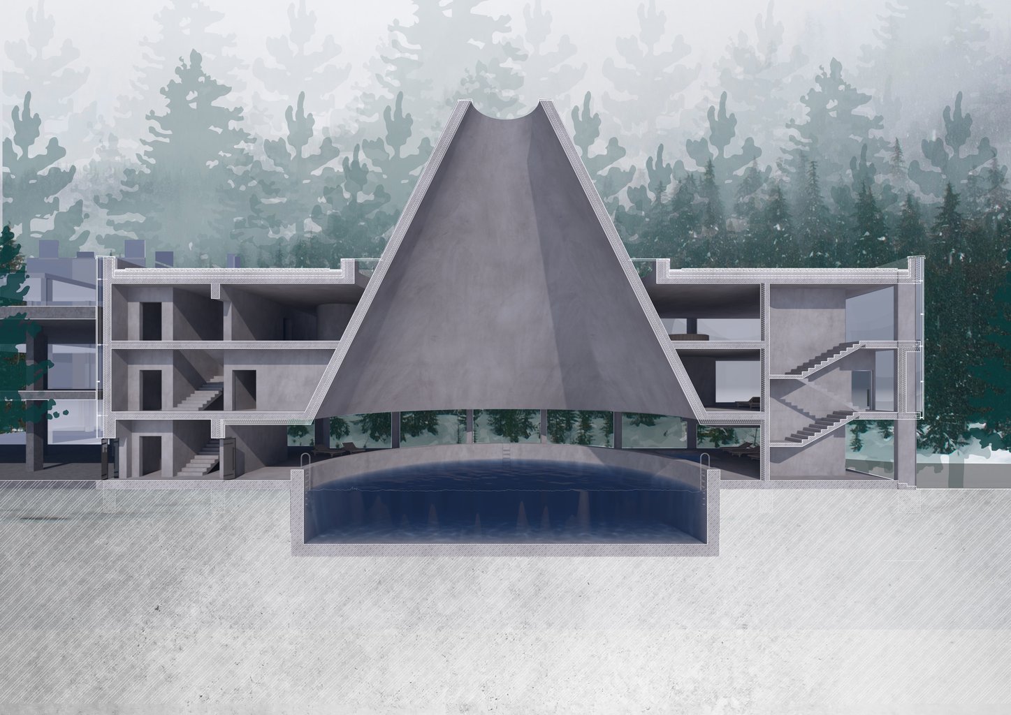 Vztah budovy k okolí definuje vertikální gradace soukromí: od volně průchozího parteru na žebrech, kterým protéká krajina, až po intimní lázeňský program. Srdcem objektu je centrální betonový kužel, který skrze oculus propisuje světlo z oblohy až k vodní hladině. Konstrukci ze surového železobetonu doplňuje poloprůsvitná fasáda z polykarbonátu a zelená střecha, díky čemuž plynule splývá s krušnohorskou přírodou.