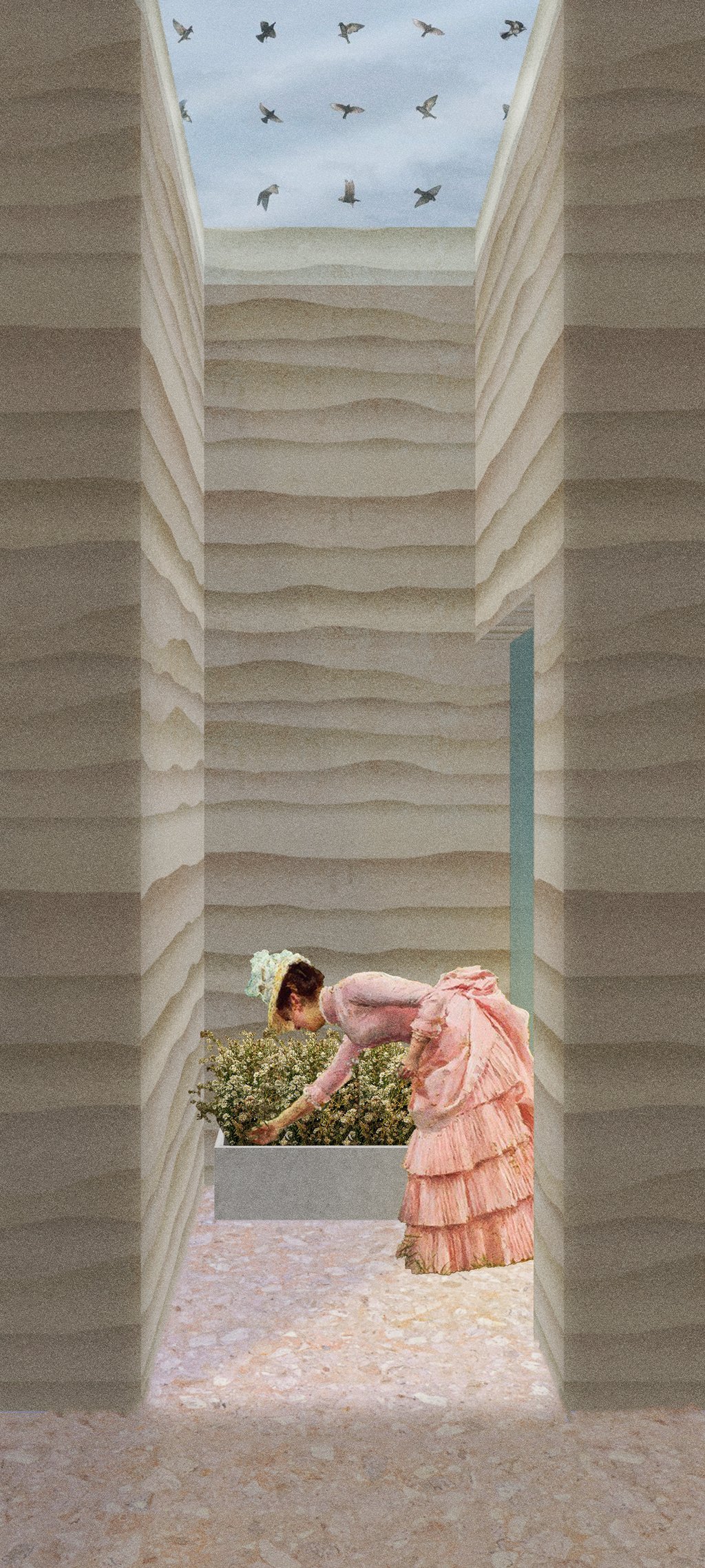 Princip uzemnění se odráží v použití dusané hlíny. Její přirozená textura, tíha a barevnost vytvářejí stabilní, klidné a bezpečné prostředí. Fyzicky a mentálně ukotvuje.