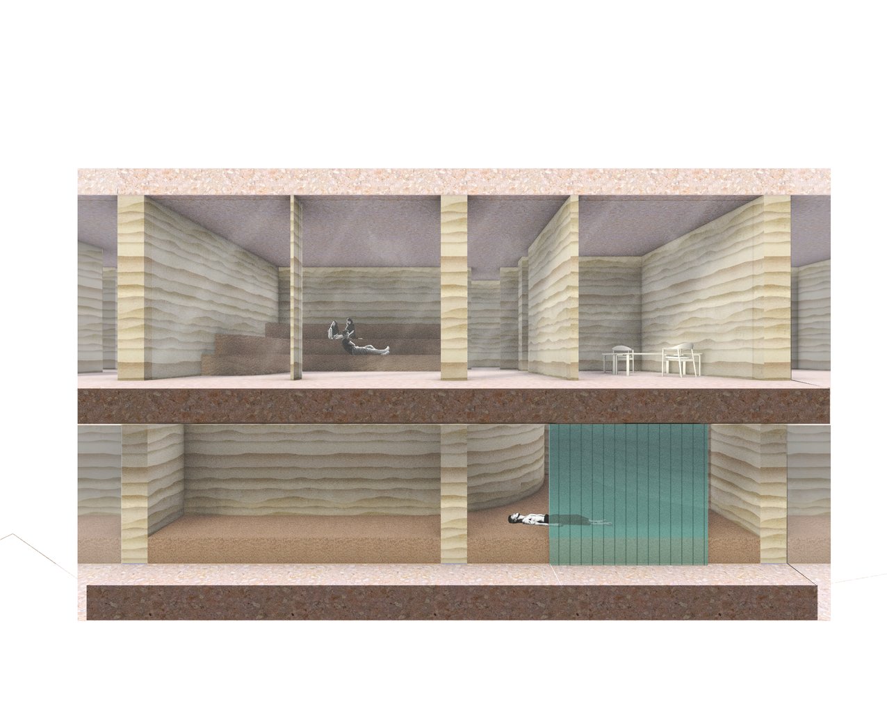 Očištění se promítá do zaoblených sprch se stropním světlíkem, které jsou předsazené z pokojů a svým tvaroslovím kladou důraz na očistu jako rituál. Voda jako prvek se také promítá do lázní, jejichž součástí je nejen menší bazén, ale také tři bazénky se slanou vodou. Lázně kromě principu očištění plní doplňkovou relaxační a regenerační funkci.