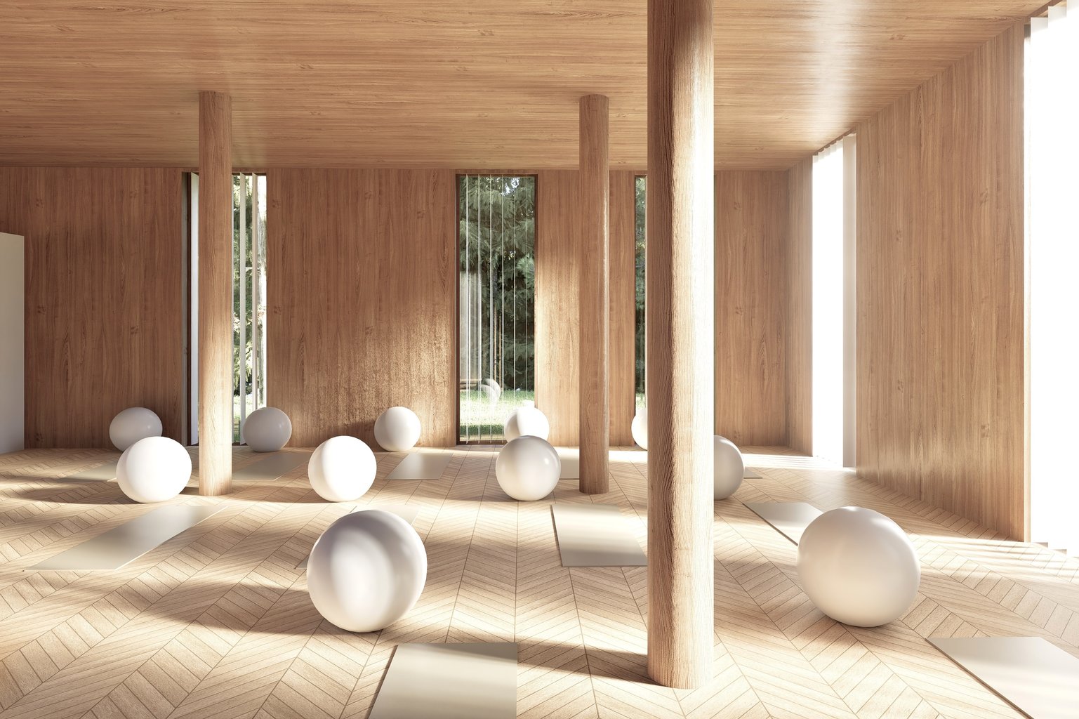 návrhu. Atrium slouží jako meditační prostor a zároveň je možné celé otevřít a propojit s pohybovými částmi jak tělocvičny, posilovny