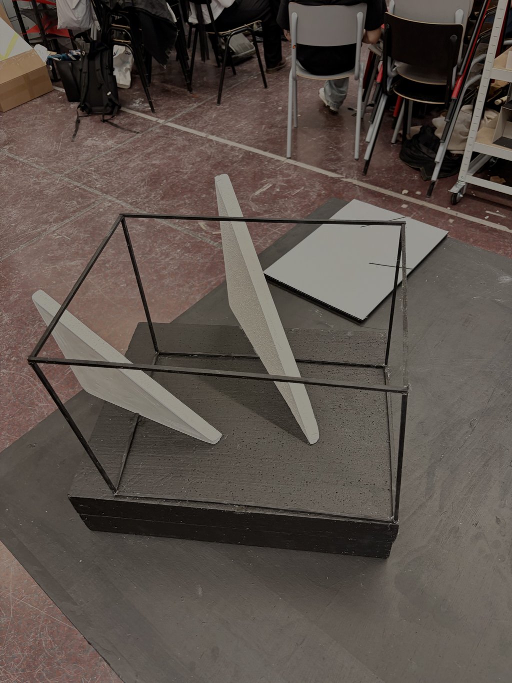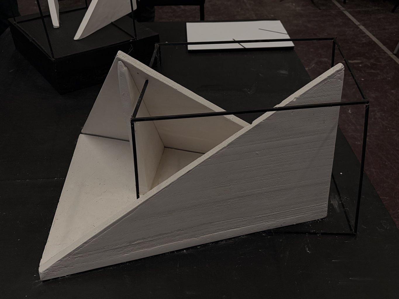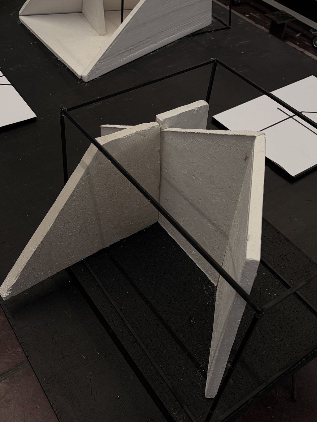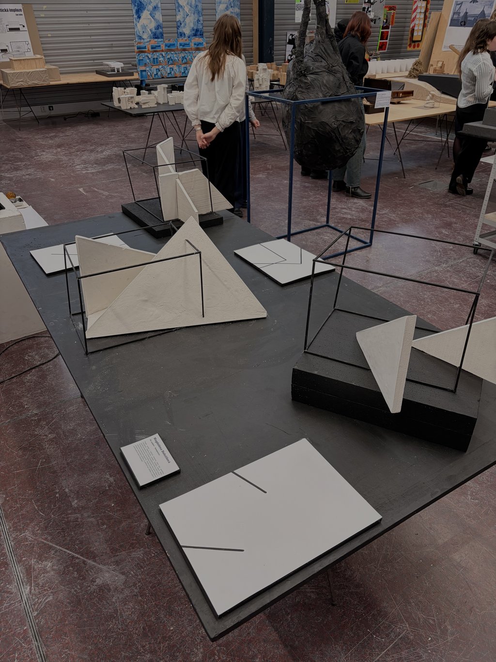 Závěrečný projekt vychází z plošných kompozic, které byly specifické naznačením prostoru. Obraz nedokreslovaly zcela úplně. Pracují s střídáním perspektivních úhlů a prostorovou představivostí. Výstupem jsou tři modely vycházející z indikace prostoru na 2D kompozicích. Materiál: sádra, dřevěné latě.