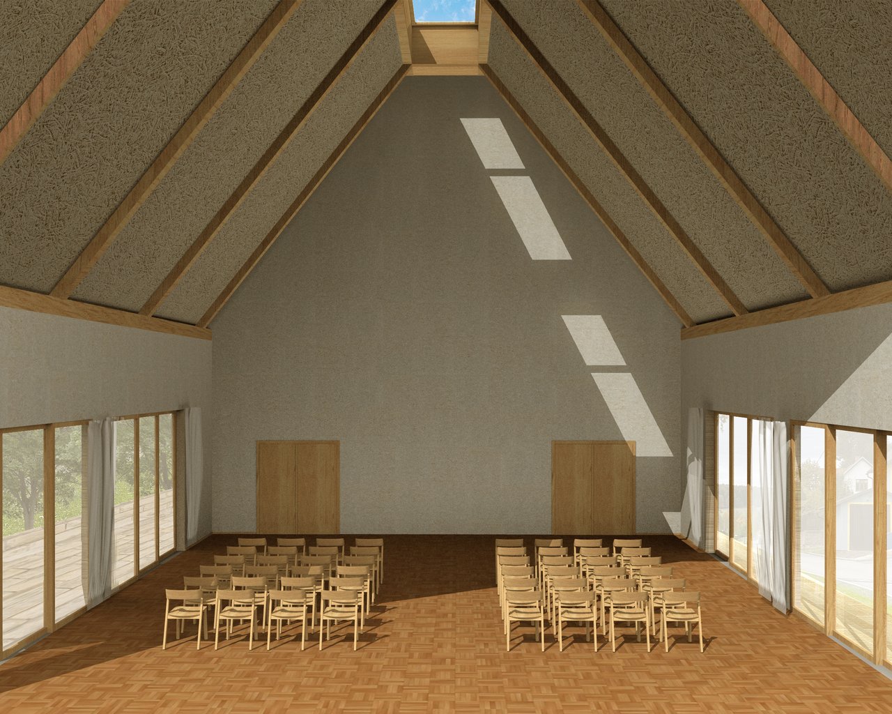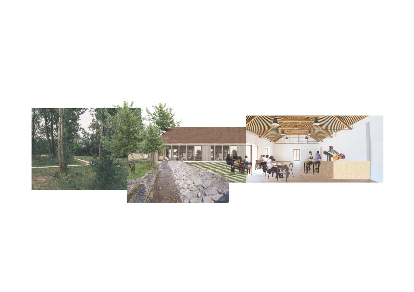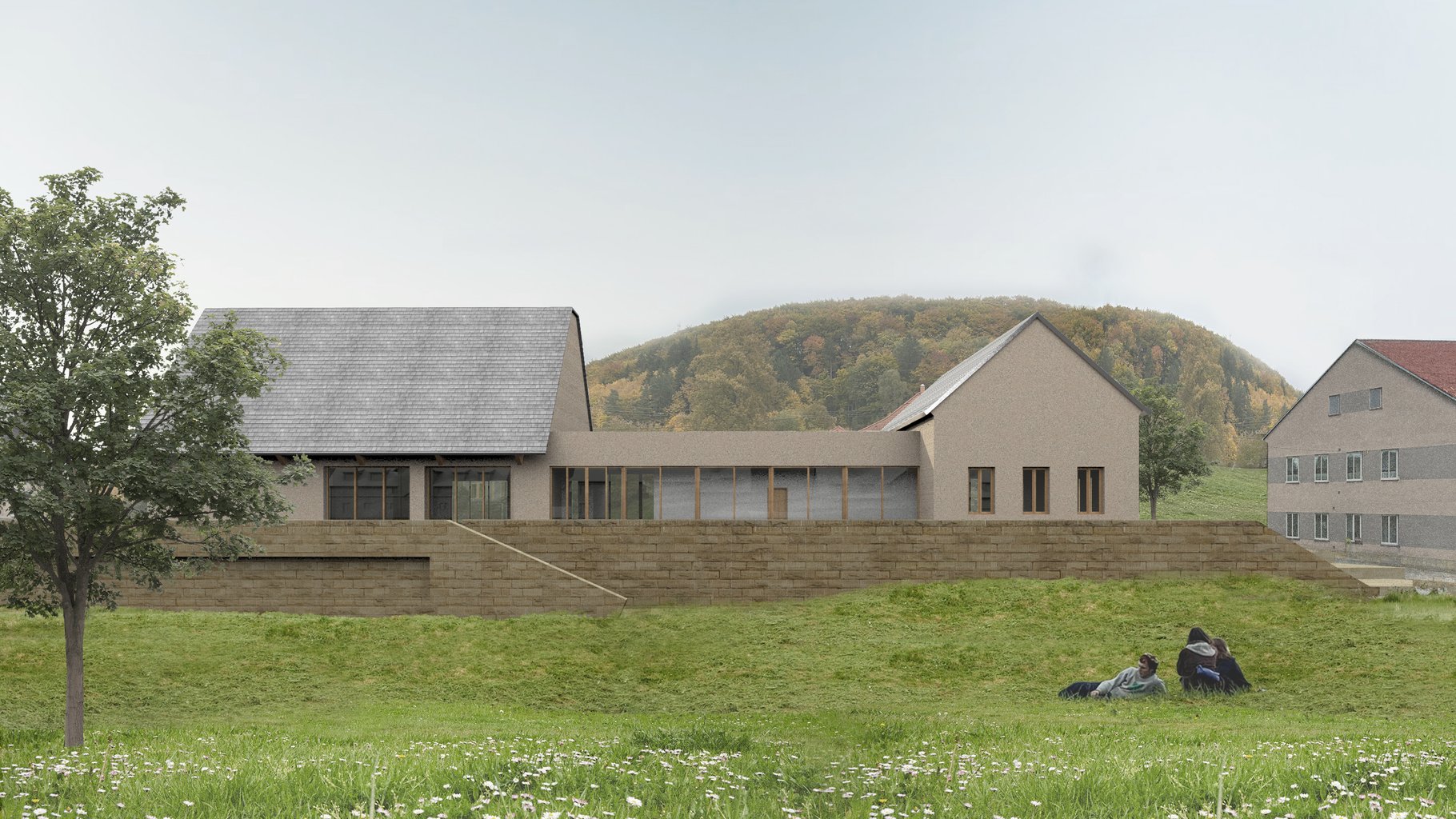 Sál i hospoda mohou jednoduše expandovat ven na sokl a pobytové platformy a z nich dále na travnatou plochu podél potoka.