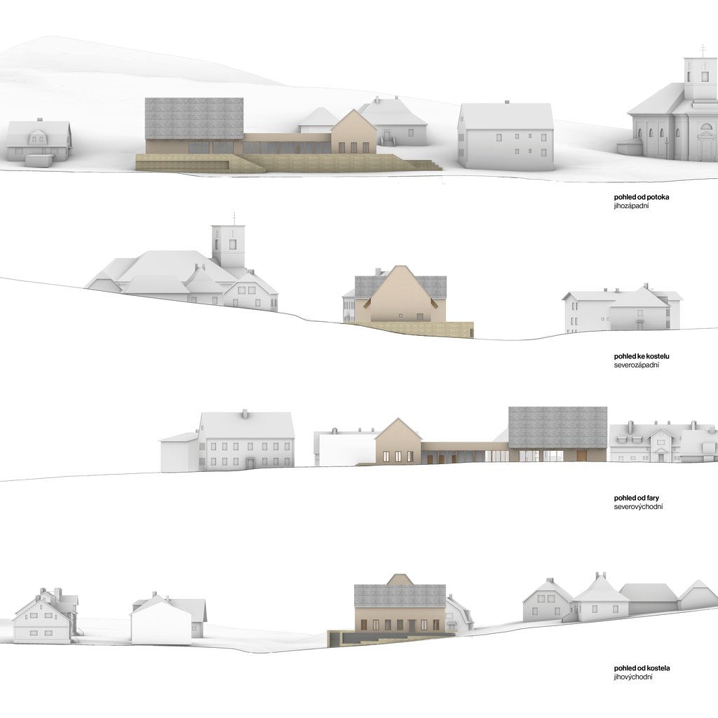 Návrh hledá nové těžiště obce s kvalitním veřejným prostorem a doplňuje chybějící občanskou vybavenost.
