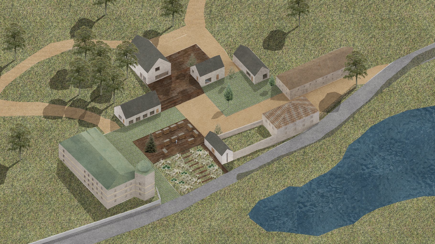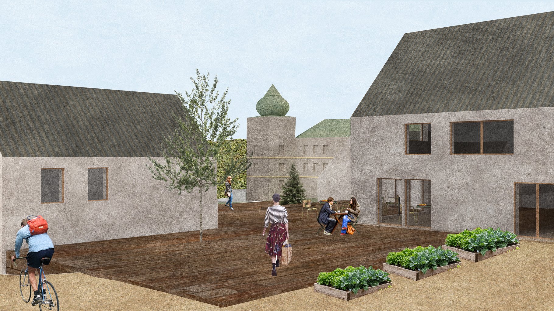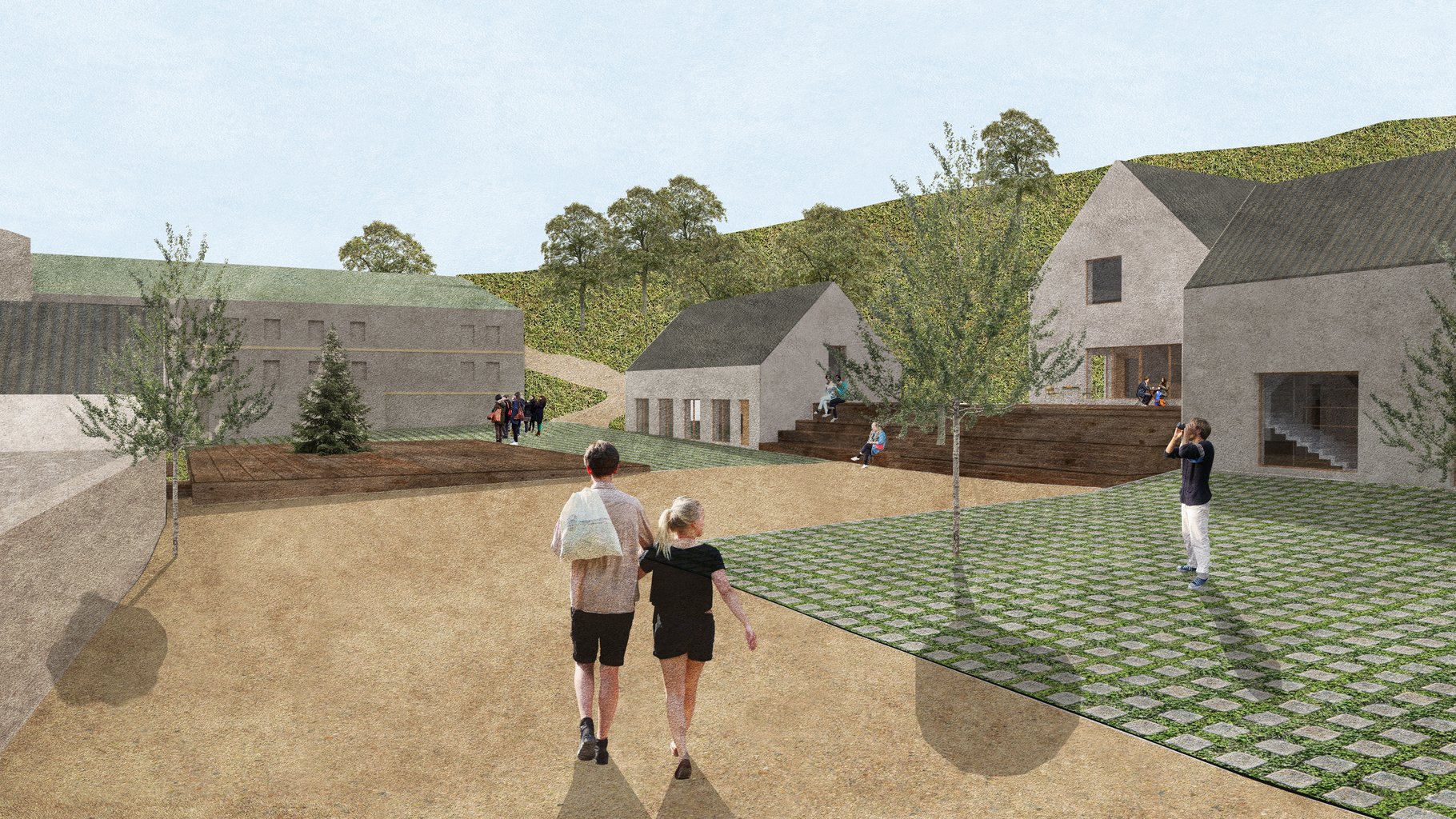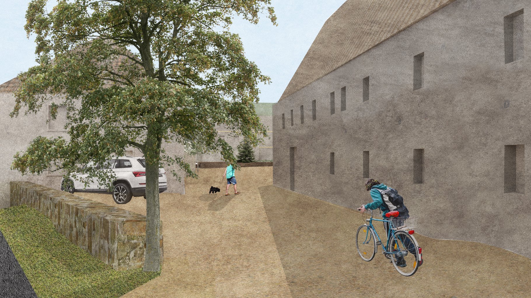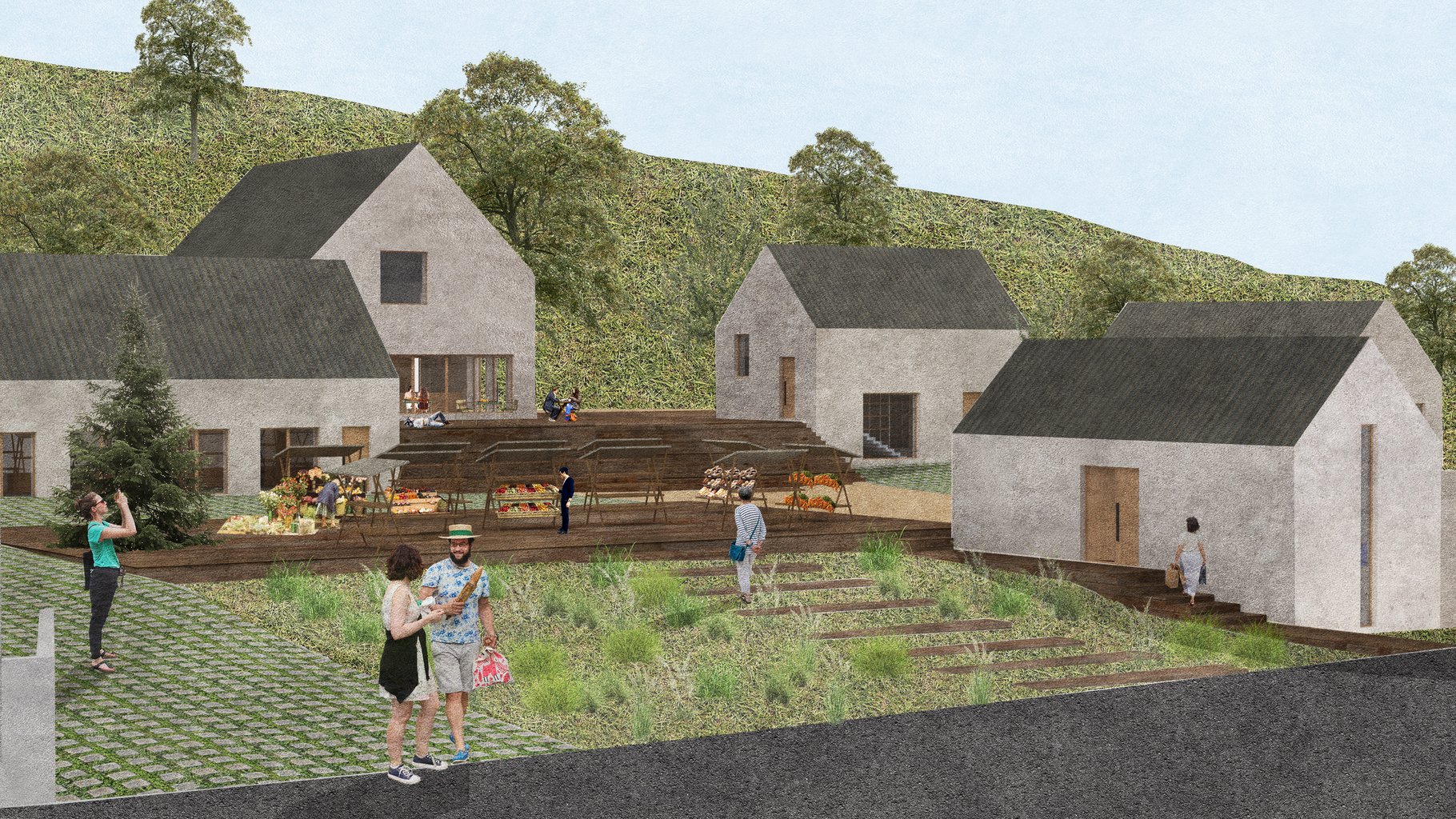 Navrhovaným zásahem je vytvoření nové návsi, která by se stala přirozeným společenským centrem obce a místem setkávání místních obyvatel i návštěvníků. Součástí návrhu je pět nových funkcí: pekárna, řemeslná dílna, knihovna, obchod s potravinami zaměřený na produkci místních farmářů a kaple sv. Jana Nepomuckého. Náves je doplněna dvěma dřevěnými vyvýšenými platformami. Spodní platforma je určena pro pořádání kulturních akcí a pravidelných farmářských trhů, které se zde budou konat o víkendech, a zároveň poskytuje prostor pro umístění vánočního stromu.