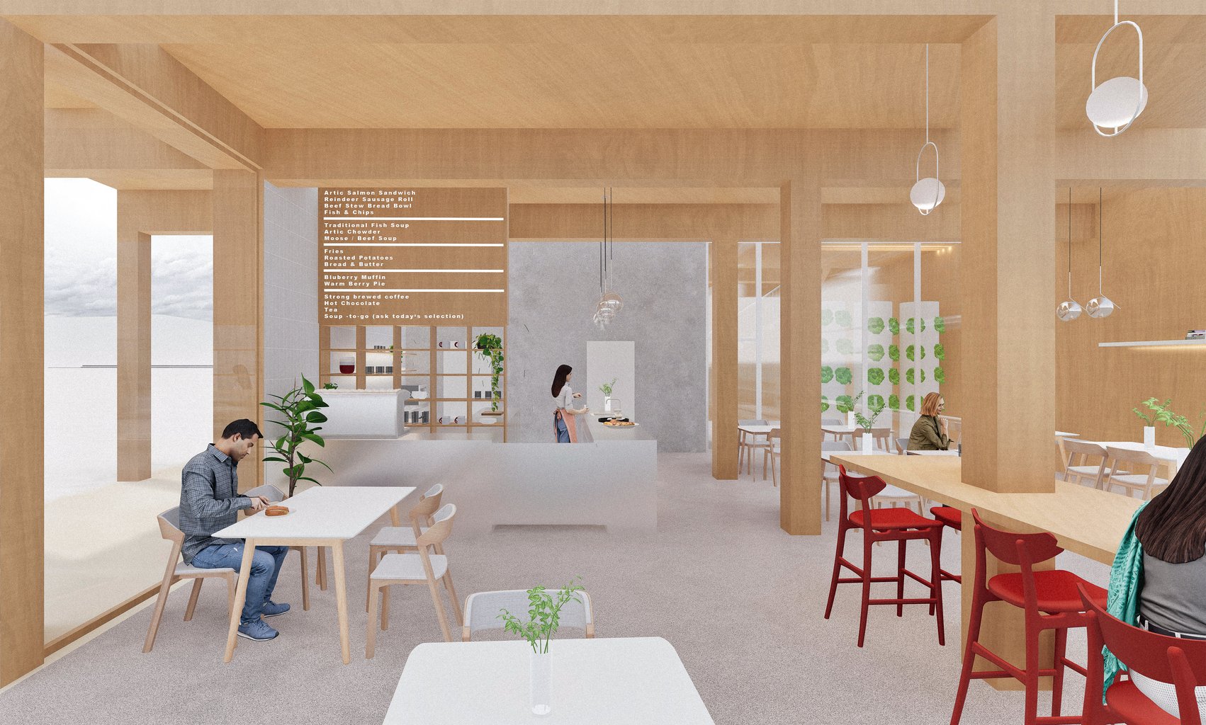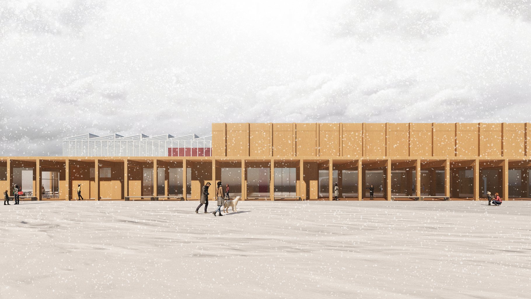 Hydroponický skleník je navržen jako konstrukce v konstrukci, doplněna o lomené střechy. Navrhované komunitní centrum doplňuje okolní zástavbu a vytváří aktivní veřejný prostor, který rozšiřuje možnosti společenského života ve městě Barrow.