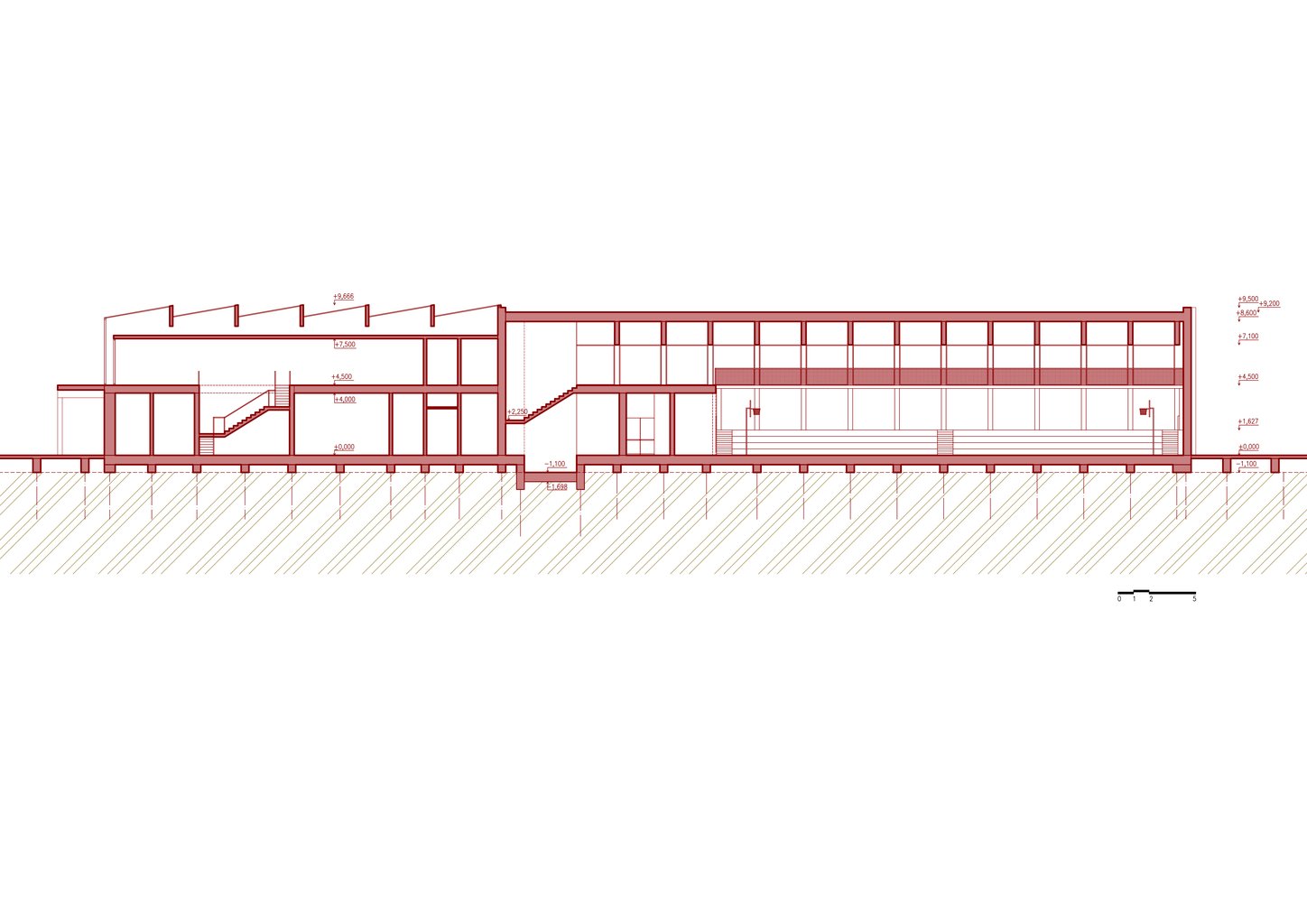 Hmotové řešení objektu vychází z potřeby přizpůsobení se náročným klimatickým a geotechnickým podmínkám. Stavba je navržena jako nízký, dvoupodlažní objekt s horizontálním výrazem, který