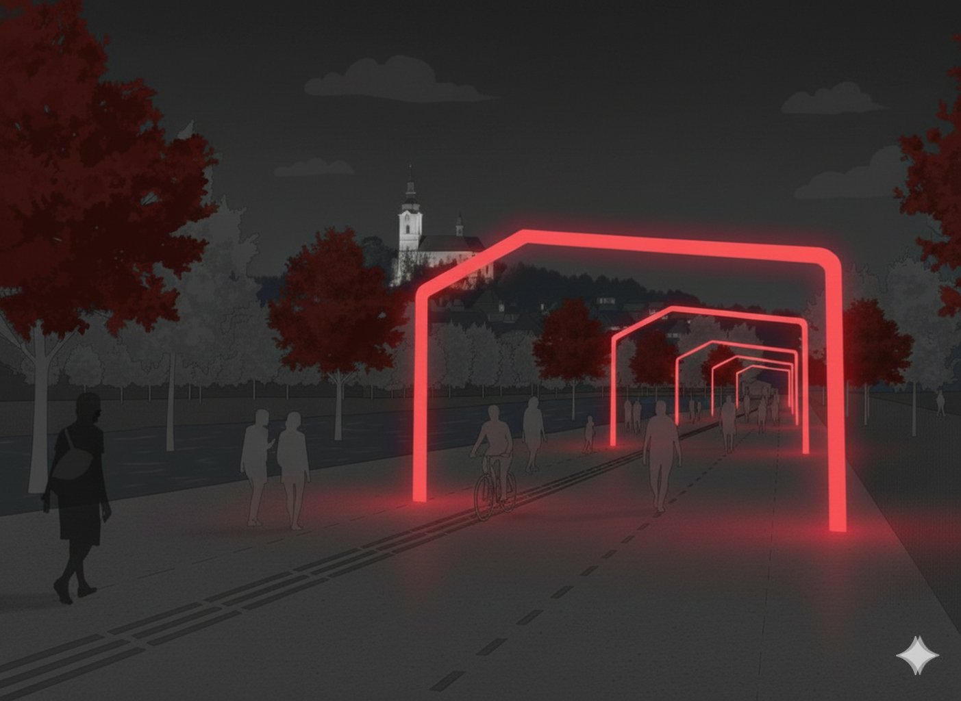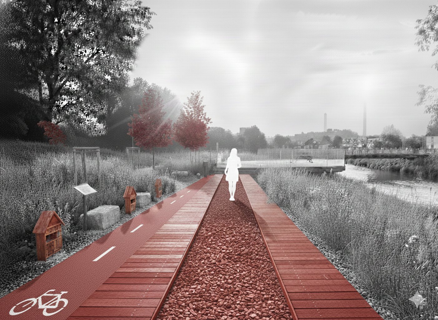 Varnsdorfská stezka je ,,živé vlákno“ propojující město od nádraží přes náměstí až k řece Mandavě. Není to jen cesta, ale vrstvenatý příběh aktivující prostor skrze světlo, zvuk, umění a přírodu. V klíčových bodech setkávání stezka mění industriální dědictví v intenzivní zážitek. Projekt odkrývá zapomenutý potenciál veřejného prostoru a mení běžnou chůzi v obohacující dialog člověka s městem.