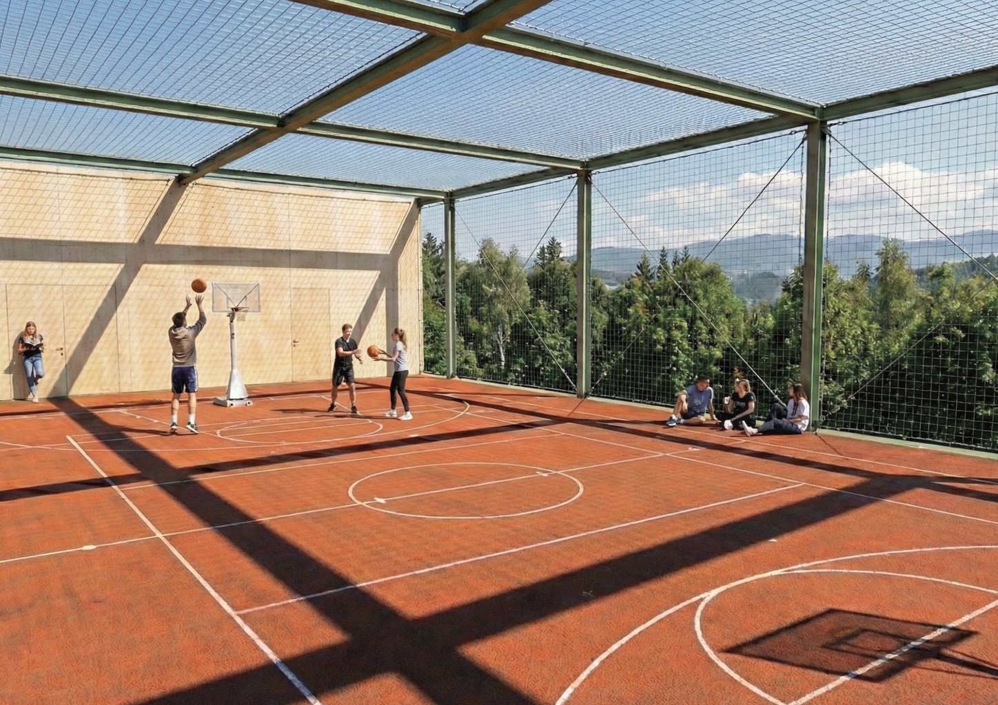 Nejvyšší patro budovy je věnováno aktivnímu odpočinku. Venkovní hřiště vymezené ocelovou sítí levituje nad zbytkem stavby a je přístupné samostatným schodištěm, které vede od atria vzhůru a funguje nezávisle na provozu knihovny či kavárny. Jižní fasádu domu chrání posuvné ocelové zástěny. Jejich primárním úkolem je stínění proti slunci a odclonění hluku