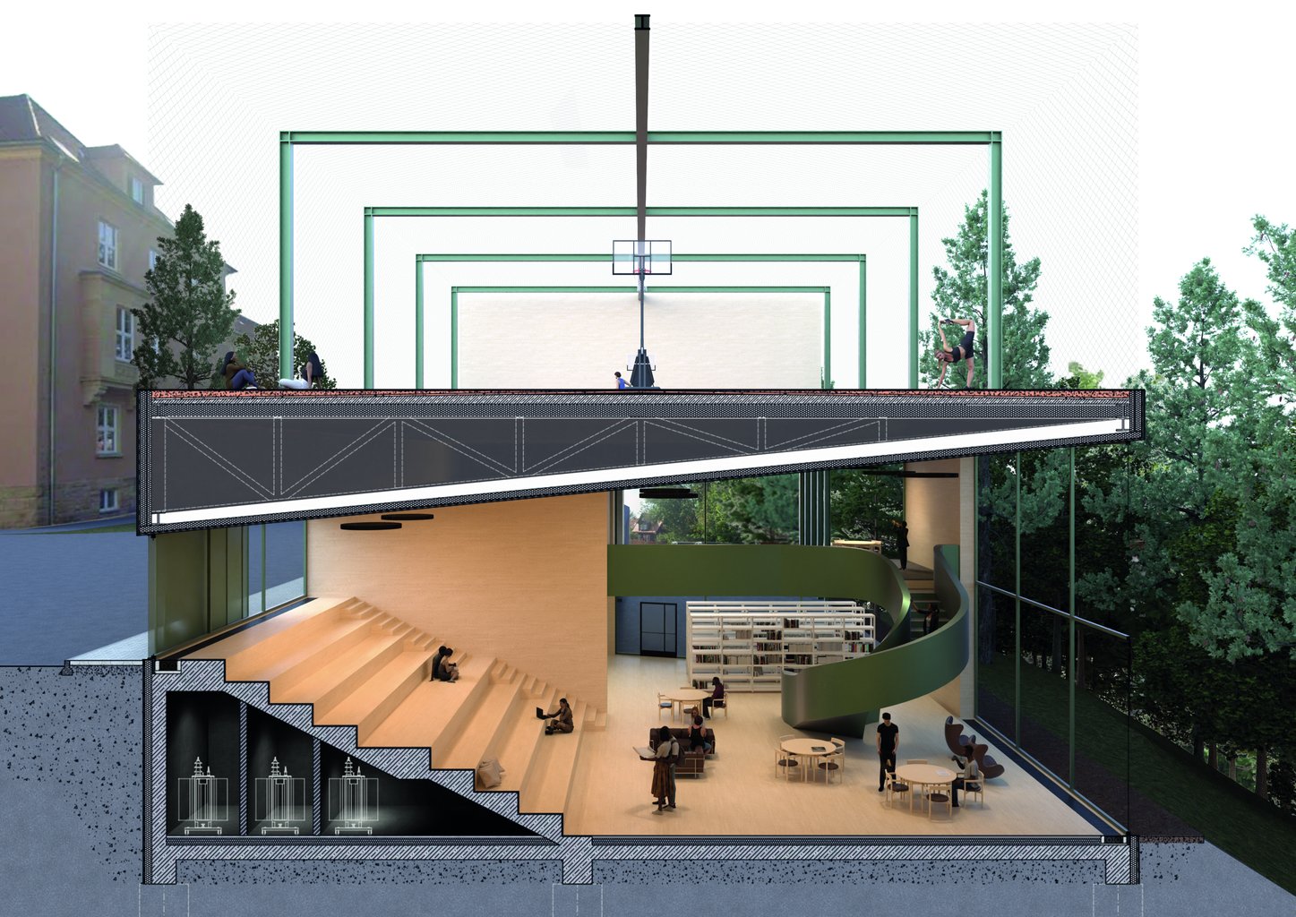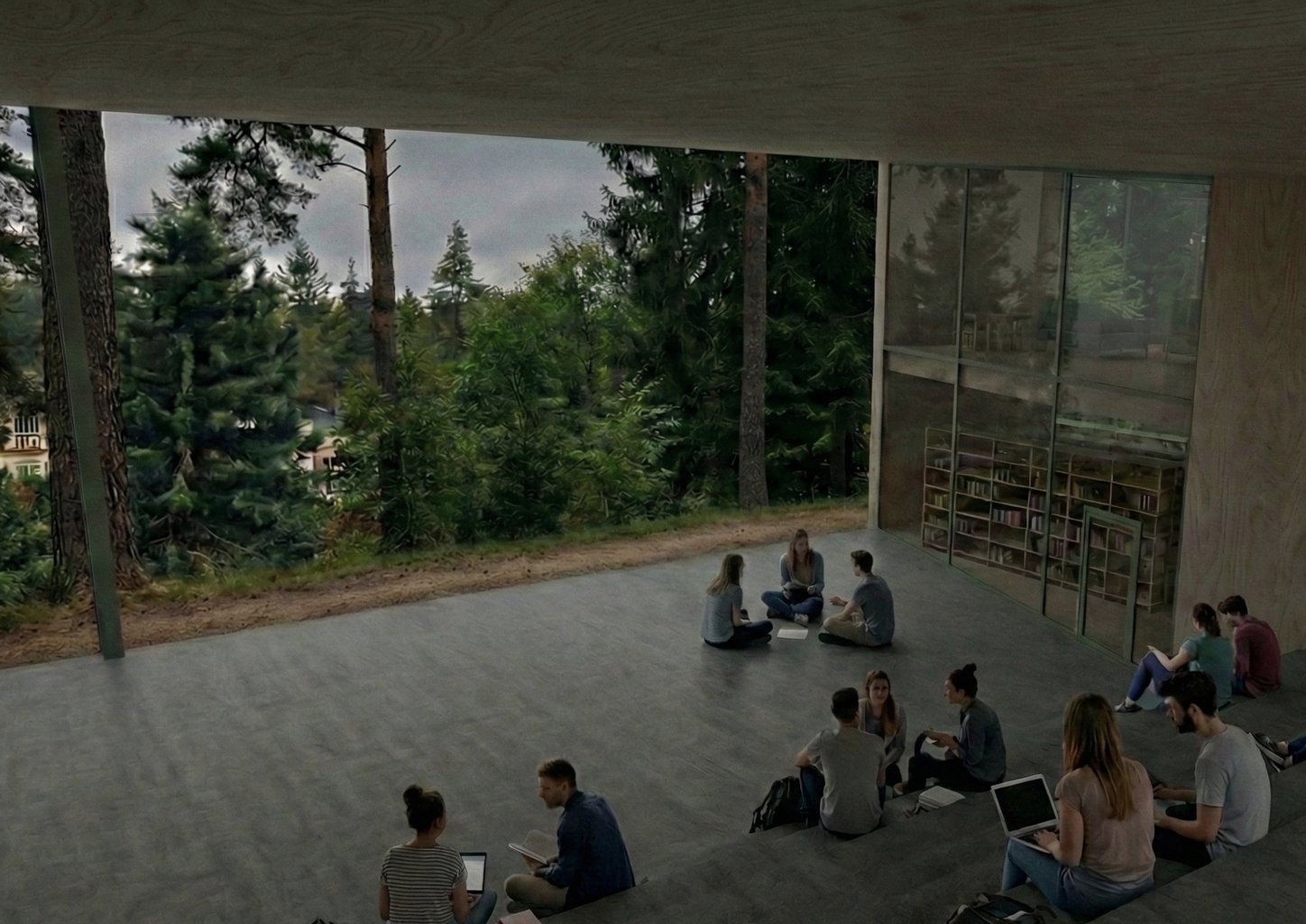 Návrh studentského centra v jádru kampusu Technické univerzity v Liberci proměňuje místo stávajícího parkoviště na živý společenský uzel. Cílem je vytvořit prostor, kde se přirozeně prolíná studium, odpočinek a sport. Hmota domu se zařezává do skalnatého svažitého terénu, čímž vzniká chráněné atrium orientované k lesu. To nabízí závětří a klidný výhled na město, což z něj dělá ideální místo pro neformální setkávání studentů.