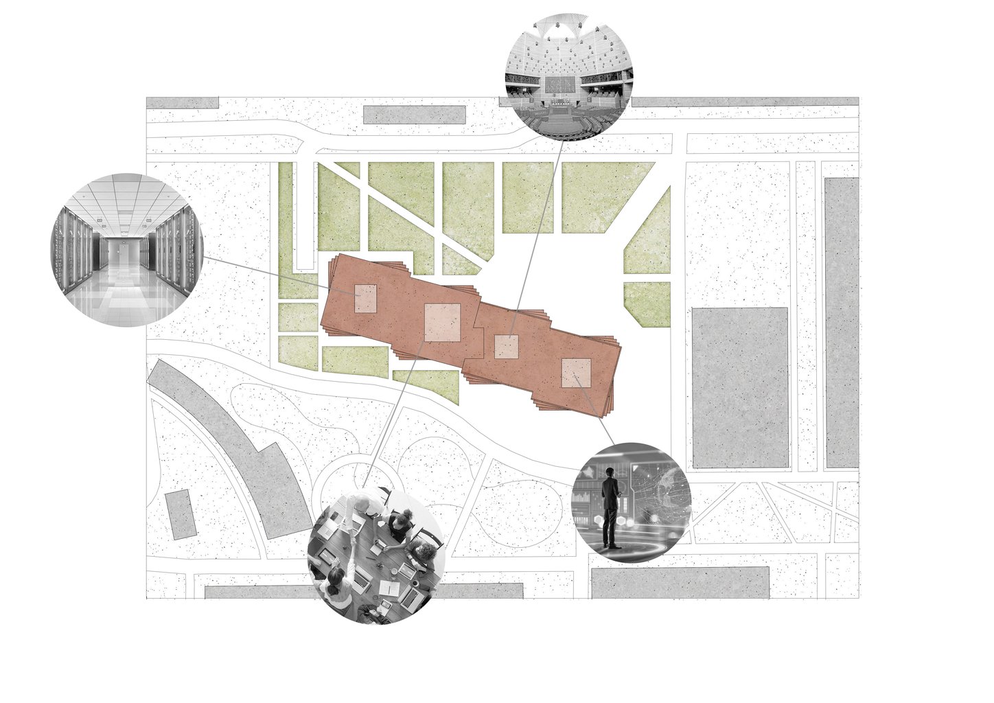 Organized into four interdependent typological wings, the building integrates a civic hub, a secure data center and a policy-making wing. This enables the transparent auditing and supervision of AI algorithms, as well as a civic-technological hub with low-latency computing available to the general public. The building proposes a new kind of typology and is designed with the idea of a future, in which data centers can be more than just noisy black boxes on the outskirt of our cities.