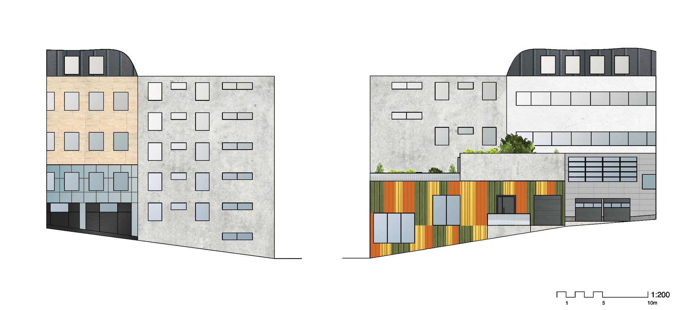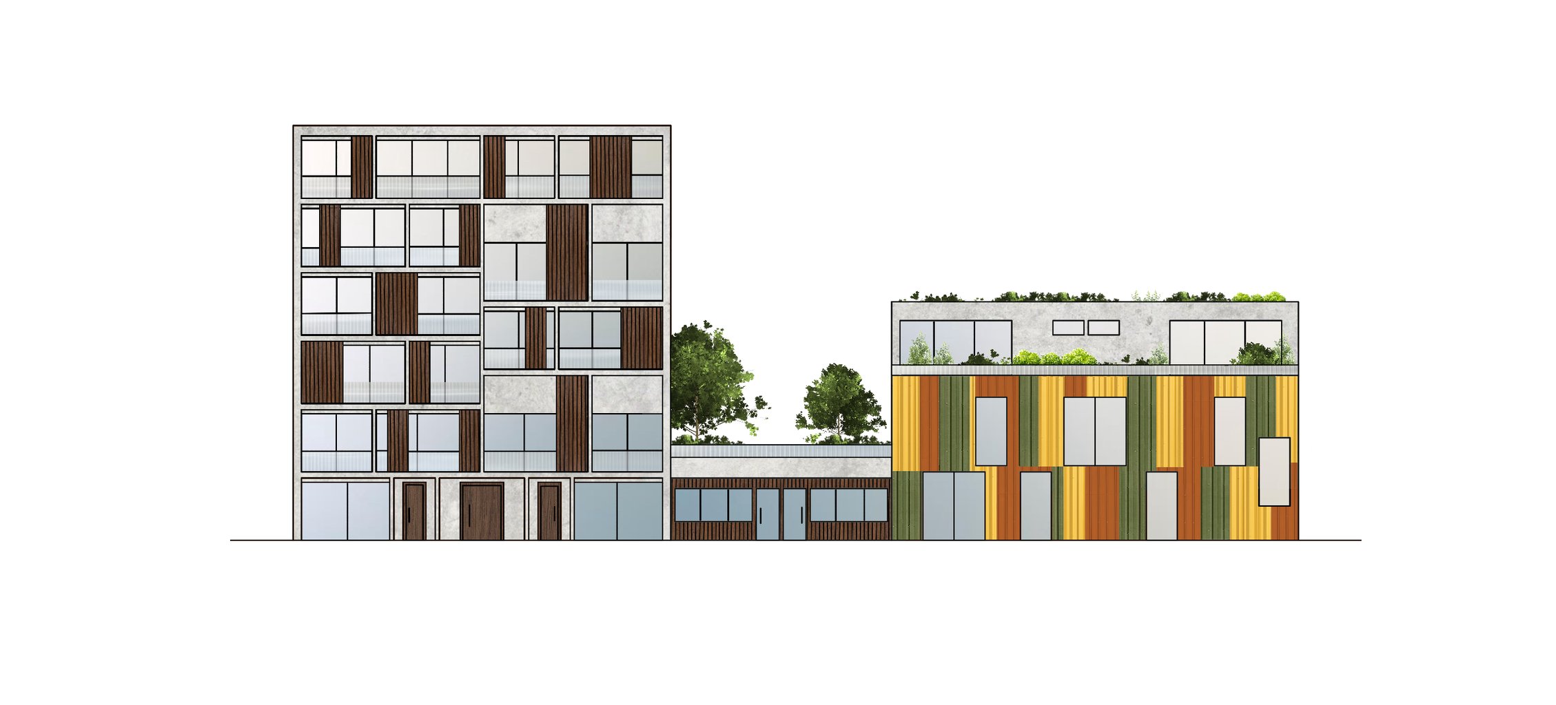 Urbanisticky je dům koncipován jako tři samostatné objemy. Navazuje tak na rytmus okolních bloků a fragmentovanou parcelaci centra, aniž by působil jako jeden masivní celek. Záměrem bylo zachovat měřítko města a současně využít každou část objemu pro specifickou funkci: bydlení, vzdělávání a veřejný parter.