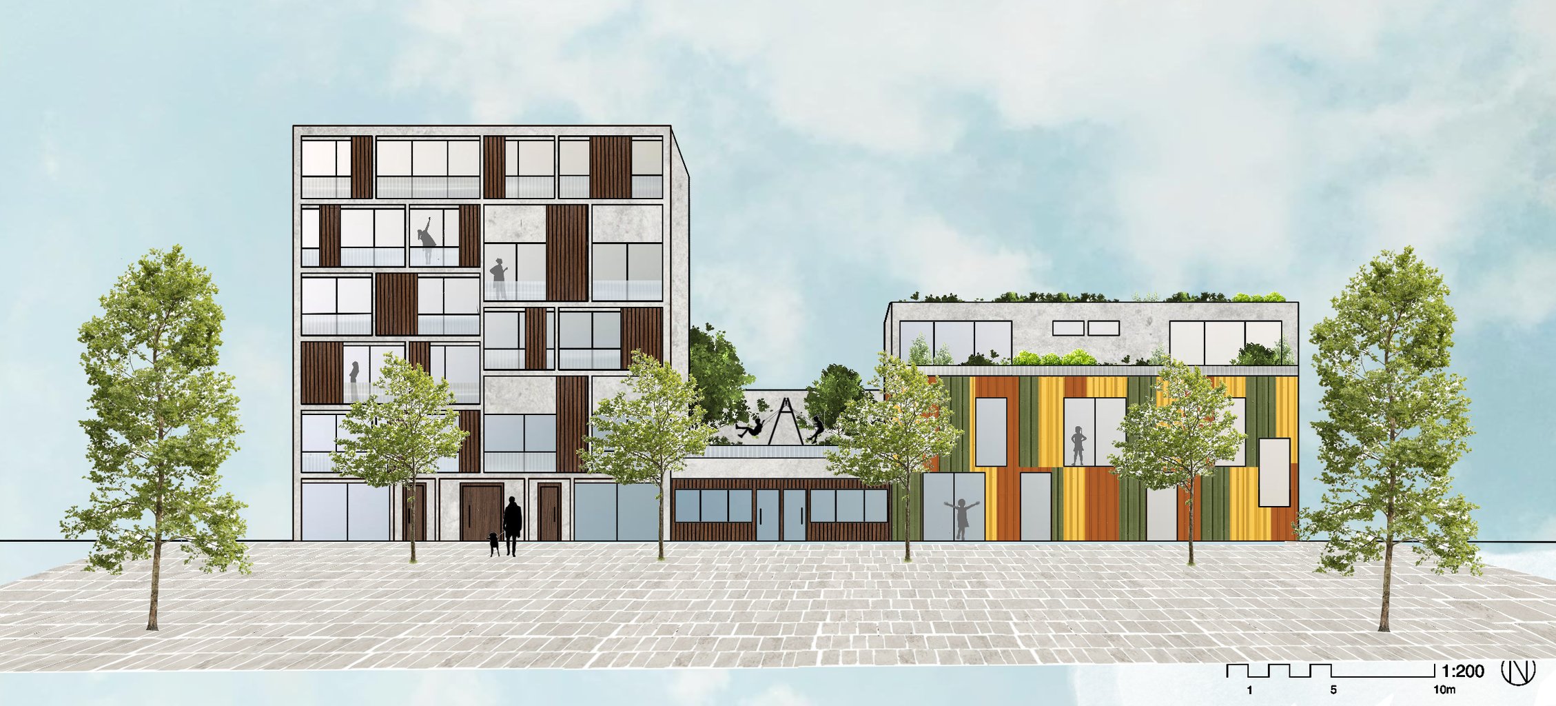 Projekt řeší doplnění proluky v centru Jablonce nad Nisou, v přímém sousedství radnice. Lokalita je významná nejen polohou, ale také městským potenciálem – nachází se na hraně současného automobilového provozu a plánované pěší zóny, která má v budoucnu posílit centrum jako místo pobytu, setkávání a městského života. Analýza města a dostupných strategií ukázala dva trvalé problémy: nedostatek dostupného bydlení a chybějící kapacity v předškolním vzdělávání. Tyto dva směry se staly základem pro program a funkční náplň stavby.