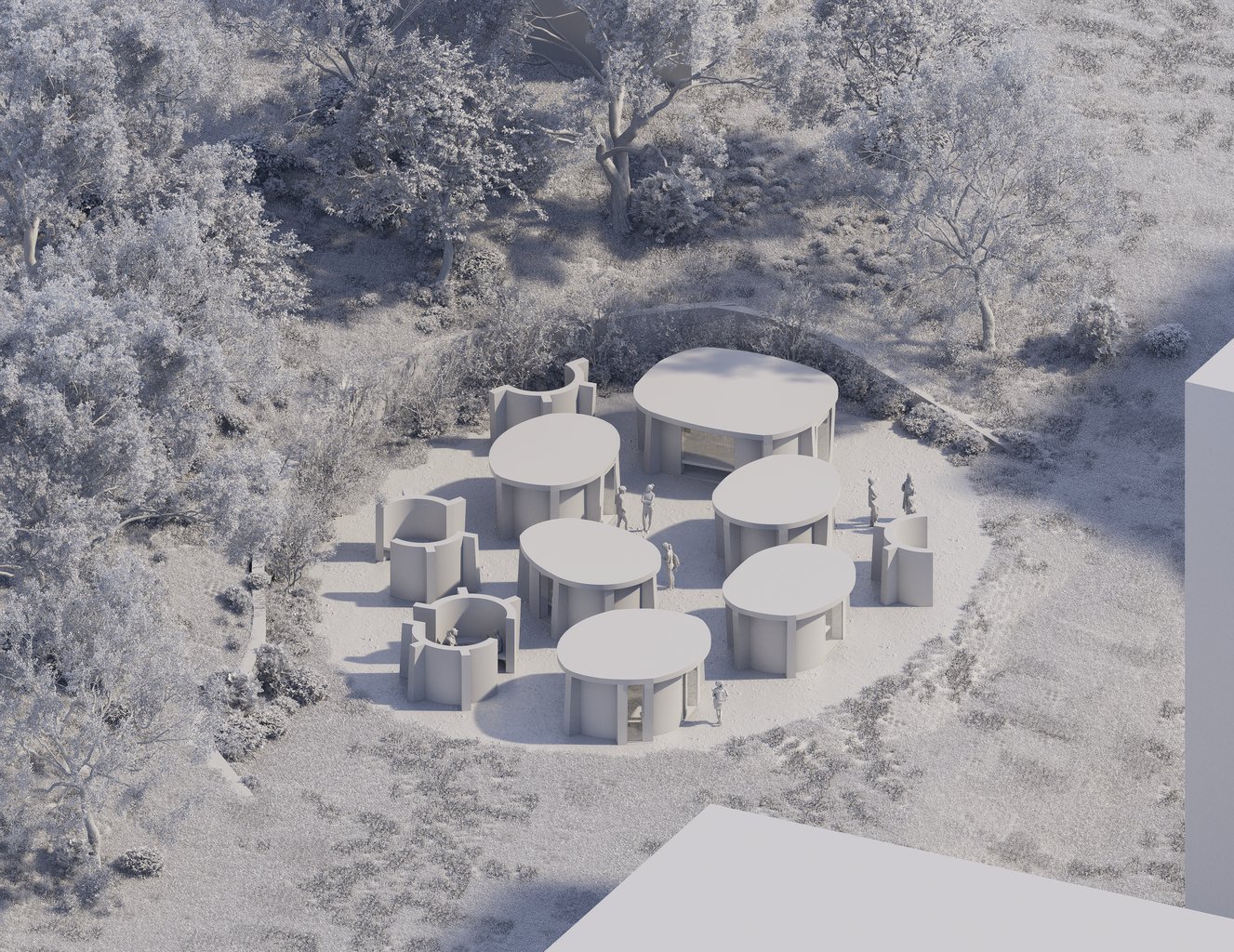 Projekt je určen studentům Technické univerzity v Liberci, kteří bydlí na kolejích na Harcově. V areálu sice fungují sportoviště, hospody i venkovní posezení, ale chybí zde klidné a volně přístupné místo, kde by se dalo studovat i mimo koleje, a to po celý rok. Proto navrhuji malé studijní buňky pro jednotlivce i menší skupiny, které nabízejí soukromí a klid bez nutnosti cokoli konzumovat.