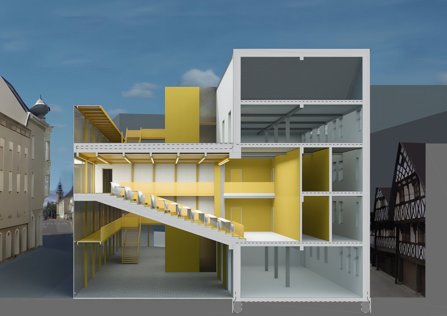 Řešení spojuje jednotlivé prostory do jednoho funkčního celku a doplňuje chybějící hmotu směrem k náměstí a pomocí falešné fasády