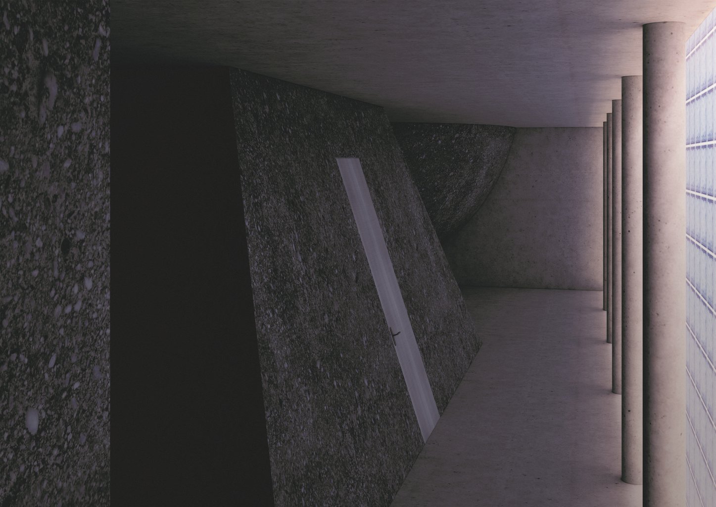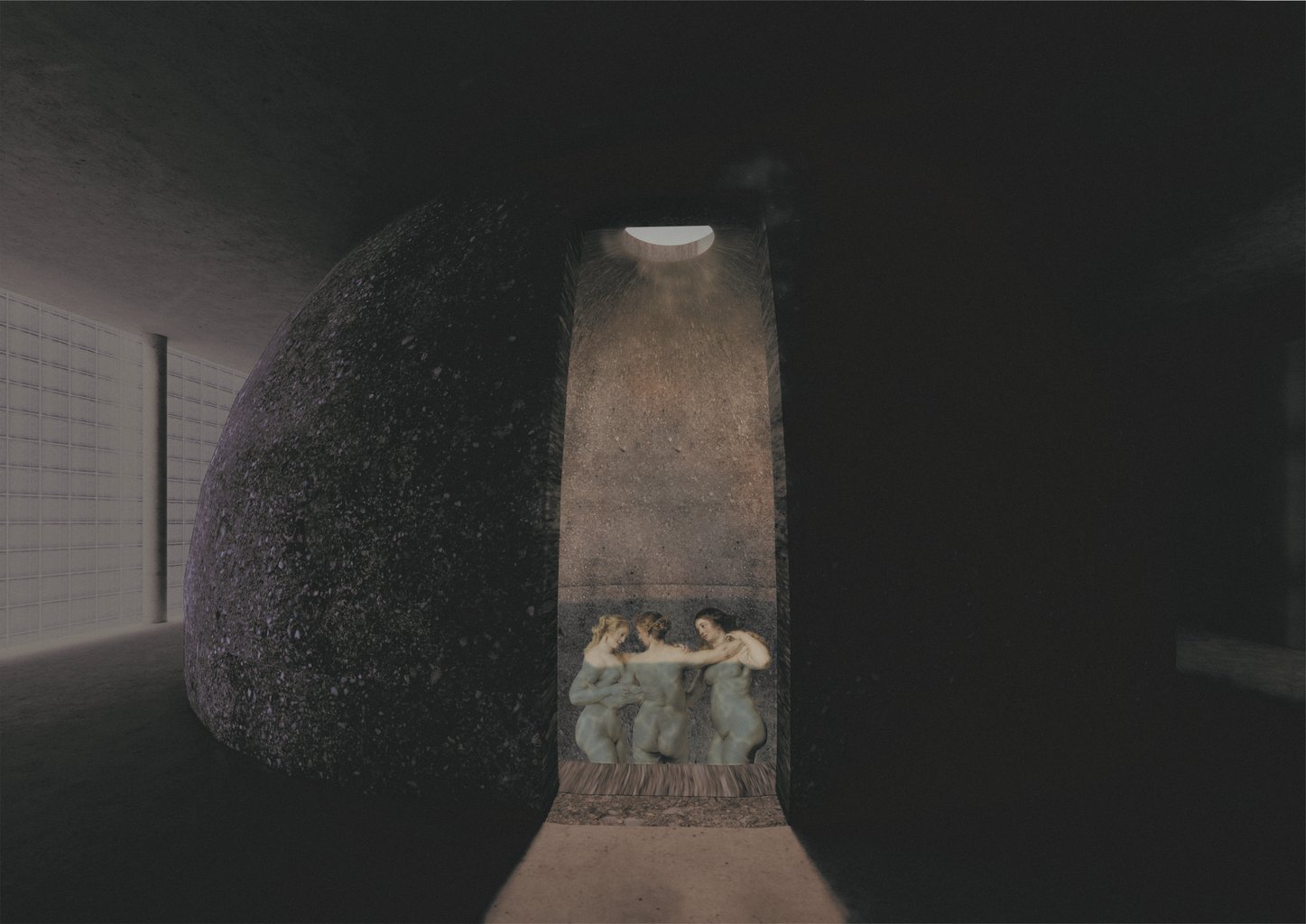 Druhé těleso, jehlan. Světlo zde stále vstupuje shora, ale v menší intenzitě. Prostor je více uzavřený a orientovaný dovnitř. Voda se zde nachází v podobě páry, která omezuje viditelnost a mění vnímání prostoru. Jehlan vytváří plynulý přechod mezi klidem a intenzivním prožitkem.