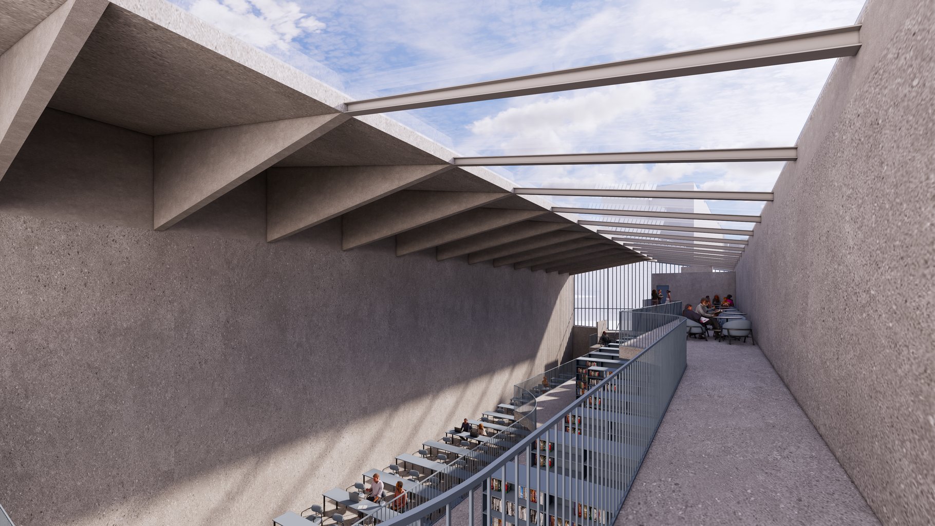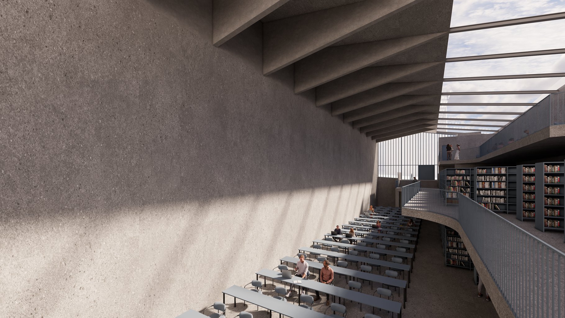 Stín zde nefunguje jako vedlejší efekt, ale jako rovnocenný prvek architektury. Právě vzájemné působení světla a stínu vytváří sled prostorových situací – od mírně zastíněných zón hluboké koncentrace až po otevřené galerie zalité denním světlem. Linie stínu formují chráněná místa pro čtení, zatímco paprsky světla vymezují hlavní osy pohybu a orientační body.