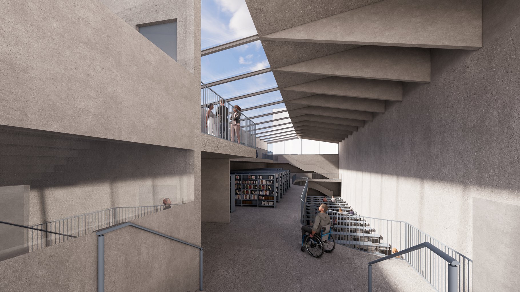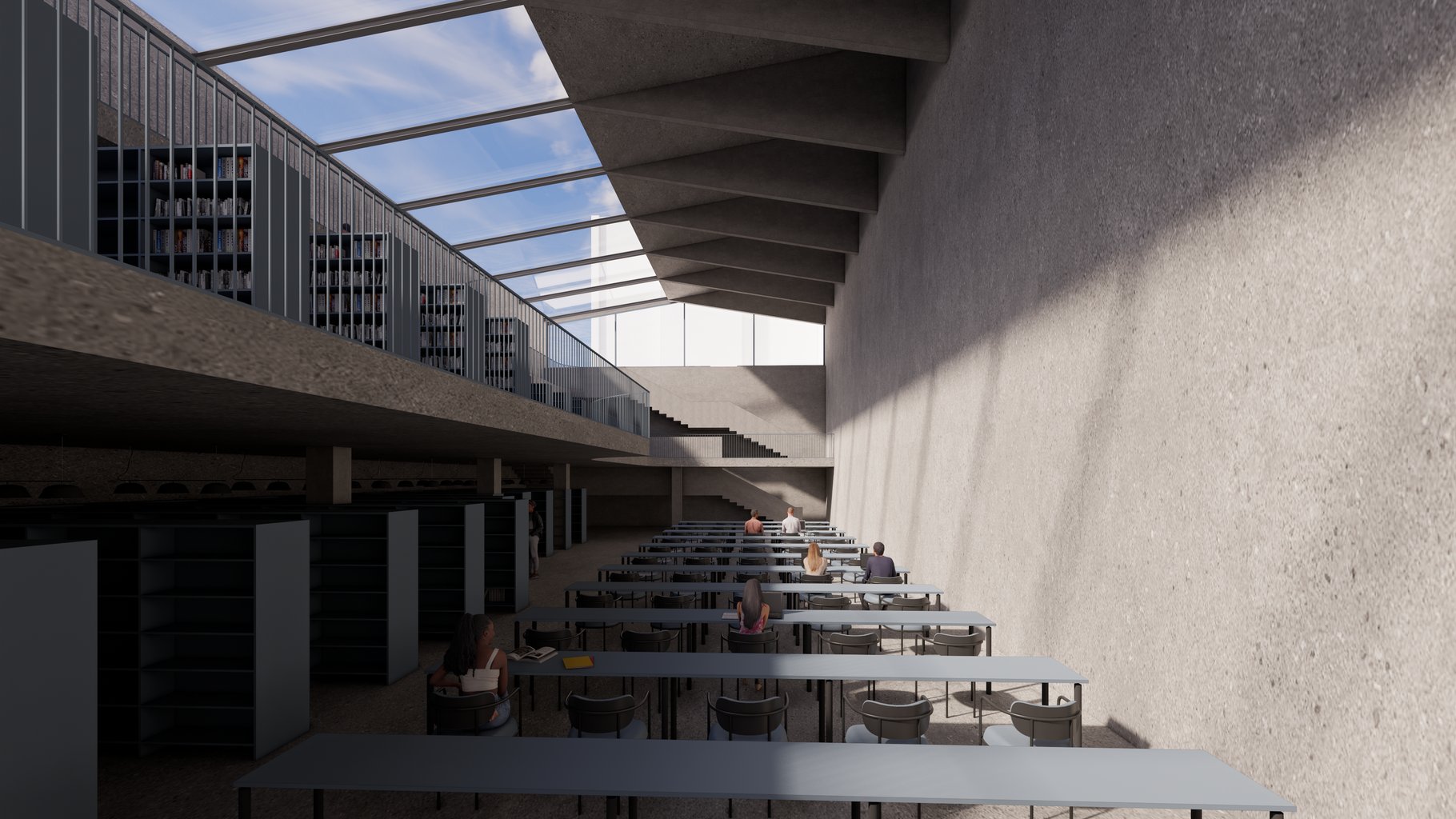Knihovna proto není vnímána jako soubor oddělených místností, ale jako nepřerušená sekvence světelných a stínových situací. Architektonický prostor vzniká z jejich vzájemného dialogu: ticho čtení je podporováno jemnými stíny a veřejné zóny se otevírají v přirozeném denním světle.